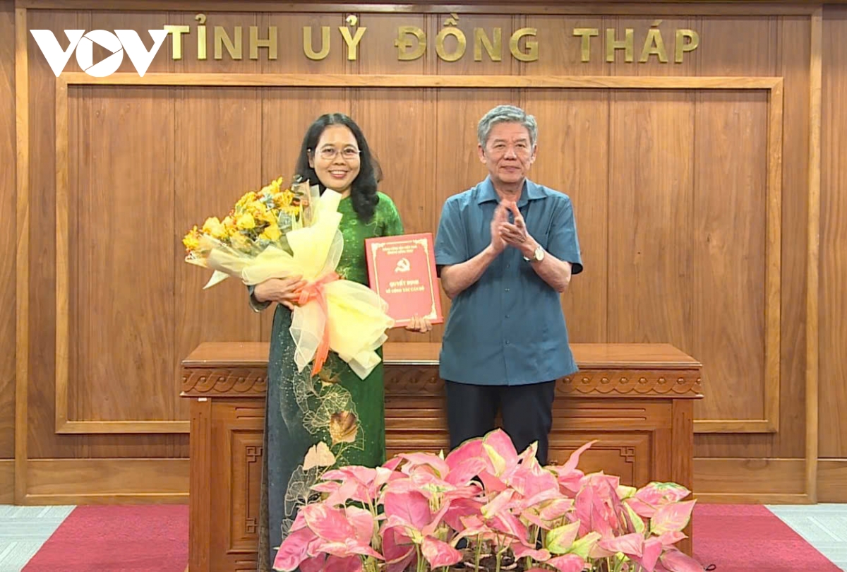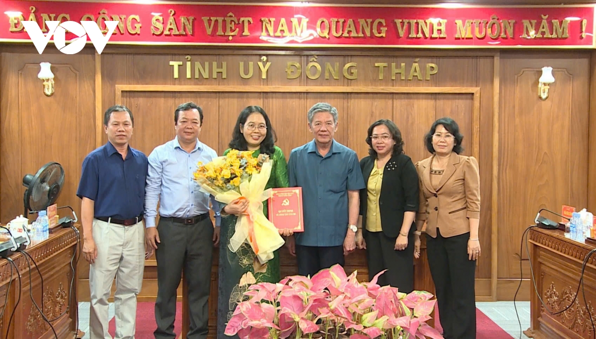 Ông Ngô Chí Cường, Bí thư Tỉnh ủy Đồng Tháp, trao Quyết định của Ban Bí thư TW Đảng chuẩn y bà Nguyễn Thị Lan giữ chức Chủ nhiệm UBKT Tỉnh ủy.