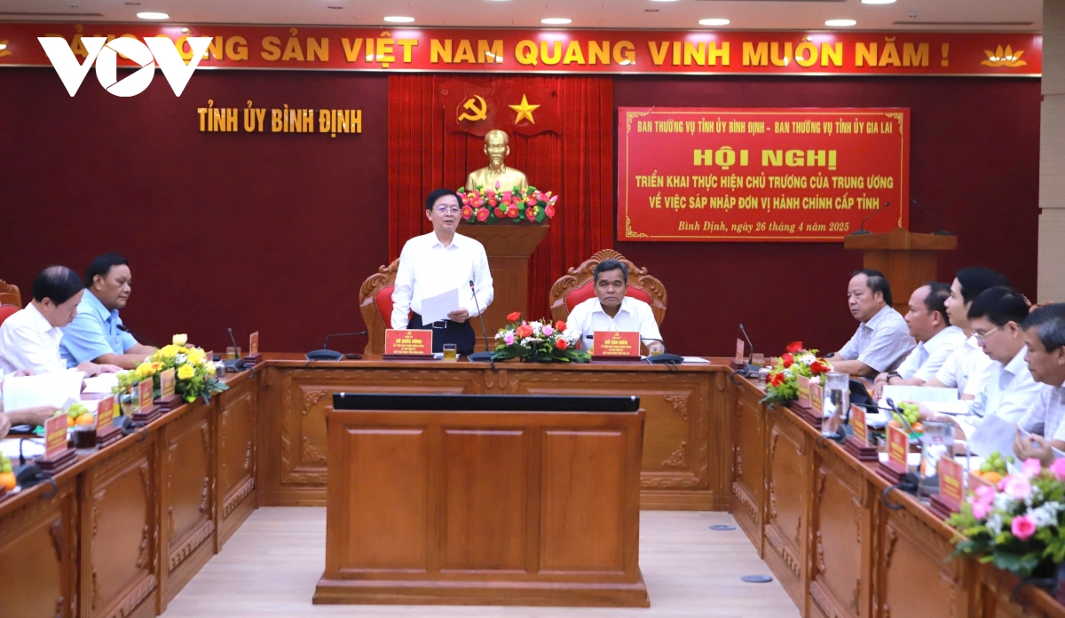 VOV.VN - Chiều nay (26/4), Ban Thường vụ Tỉnh ủy Bình Định và Ban Thường vụ Tỉnh ủy Gia Lai tổ chức Hội nghị triển khai thực hiện chủ trương của Trung ương về việc sáp nhập đơn vị hành chính cấp tỉnh. Ông Hồ Quốc Dũng, Bí thư Tỉnh ủy Bình Định và ông Hồ Văn Niên, Bí thư Tỉnh ủy Gia Lai đồng chủ trì hội nghị.