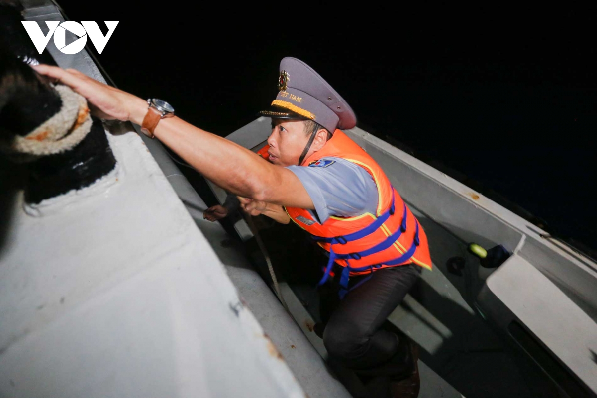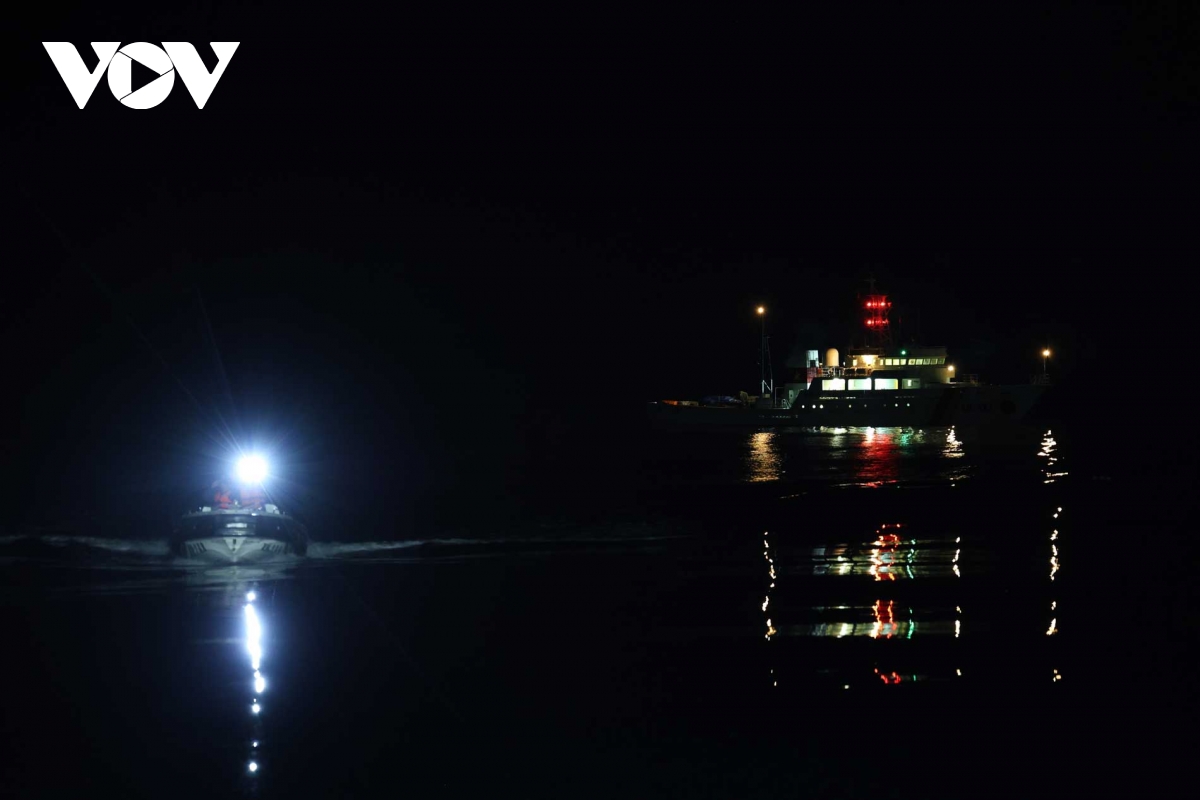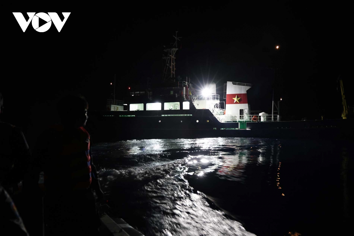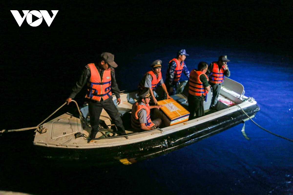Ánh đèn pha rực sáng từ xuồng công tác xé toạc màn đêm vùng biên giới biển, hướng về phía những con tàu đang neo đậu chốt giữ mặt biển. Mỗi ánh đèn là một tín hiệu ấm áp mang niềm tin của ngày hội non sông đến với tuyến đầu của Tổ quốc ở trên vùng biển.