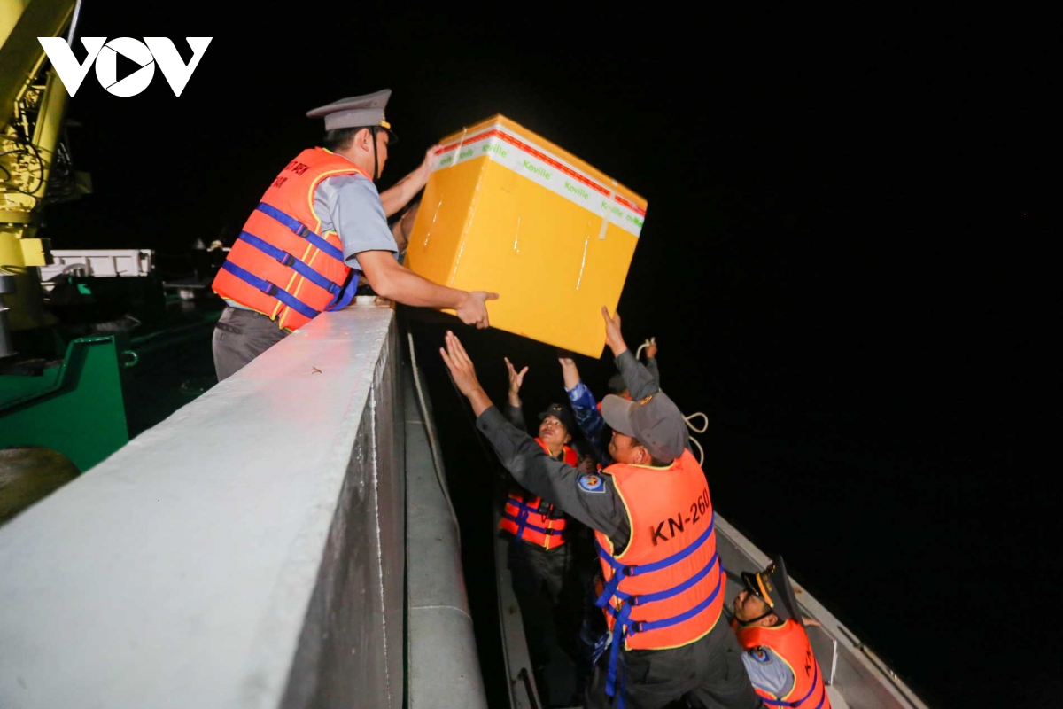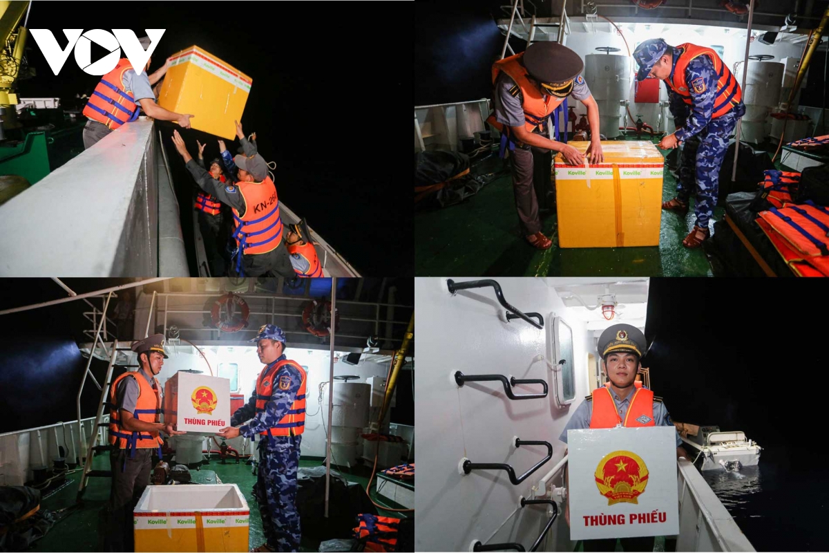 Để chống lại hơi nước mặn và những cơn sóng dữ, thùng phiếu được bọc kín cẩn thận trong một lớp thùng xốp bảo vệ. Các công đoạn chuyền tay, tháo dỡ diễn ra trân trọng ngay trên boong tàu.