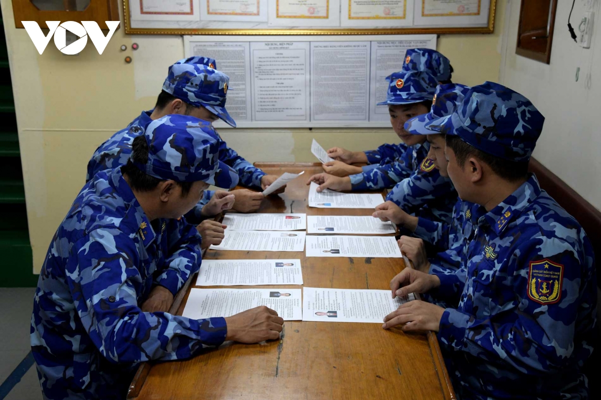 Cán bộ, chiến sĩ Cảnh sát biển Việt Nam tàu CSB 6008 đang làm nhiệm vụ trên biển tập trung nghiên cứu kỹ lưỡng tiểu sử, chương trình hành động của các ứng cử viên đại biểu Quốc hội khóa XVI và HĐND các cấp.