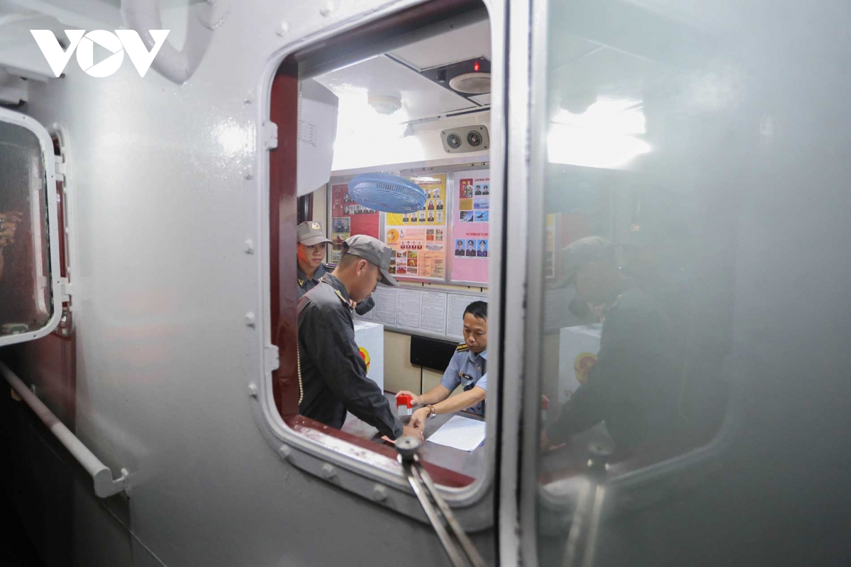 Xếp hàng trật tự dọc lối đi nhỏ hẹp của con tàu, trên tay các cán bộ, nhân viên kiểm ngư là tấm thẻ cử tri màu hồng. Không cờ hoa rực rỡ, nhưng không khí chờ đợi giờ phút bỏ phiếu vẫn diễn ra trang nghiêm và đầy tự hào.