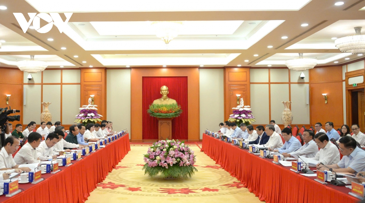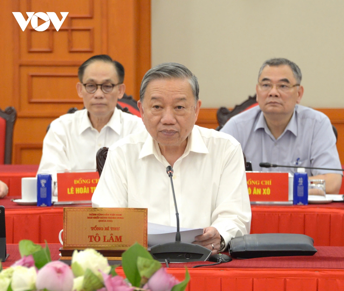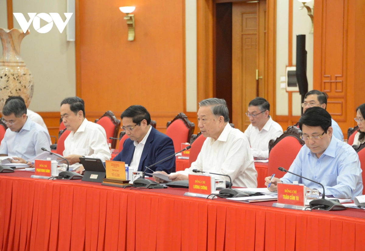 VOV.VN - Chiều 21/8, tại Trụ sở Trung ương Đảng, Tổng Bí thư Tô Lâm chủ trì cuộc làm việc của Bộ Chính trị với Ban thường vụ Thành uỷ Thành phố Hồ Chí Minh cho ý kiến vào dự thảo văn kiện và phương án nhân sự cấp uỷ Đại hội Đảng bộ thành phố nhiệm kỳ 2025-2030.