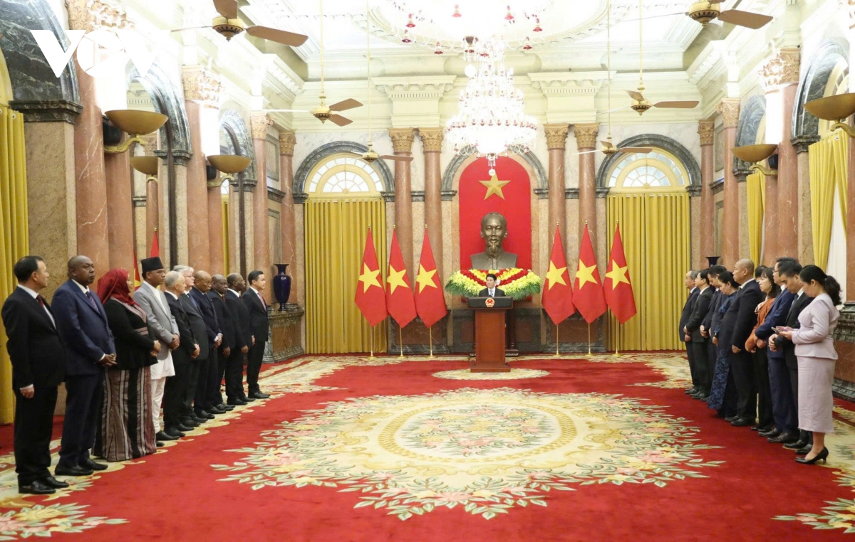 "Hướng tới chặng đường phát triển phía trước, chúng tôi luôn trân trọng, ghi nhớ sự hỗ trợ và ủng hộ quý báu mà các nước bạn bè, đồng chí, anh em, trong đó, có các quốc gia mà các Đại sứ đại diện đã dành cho chúng ta trên chặng đường đấu tranh giải phóng dân tộc, thống nhất đất nước trước đây, cũng như trong xây dựng và phát triển đất nước ngày nay", Chủ tịch nước nhấn mạnh.