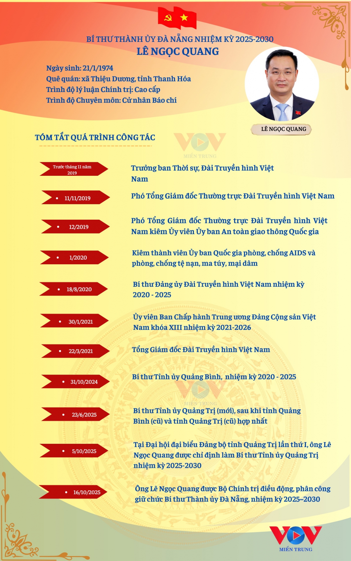 VOV.VN - Chiều 16/10, Thành ủy Đà Nẵng tổ chức Hội nghị công bố quyết định của Bộ Chính trị về công tác cán bộ. Ông Lê Ngọc Quang, Ủy viên Trung ương Đảng, Bí thư Tỉnh ủy Quảng Trị nhiệm kỳ 2025-2030 được Bộ Chính trị điều động, phân công giữ chức Bí thư Thành ủy Đà Nẵng nhiệm kỳ 2025-2030.