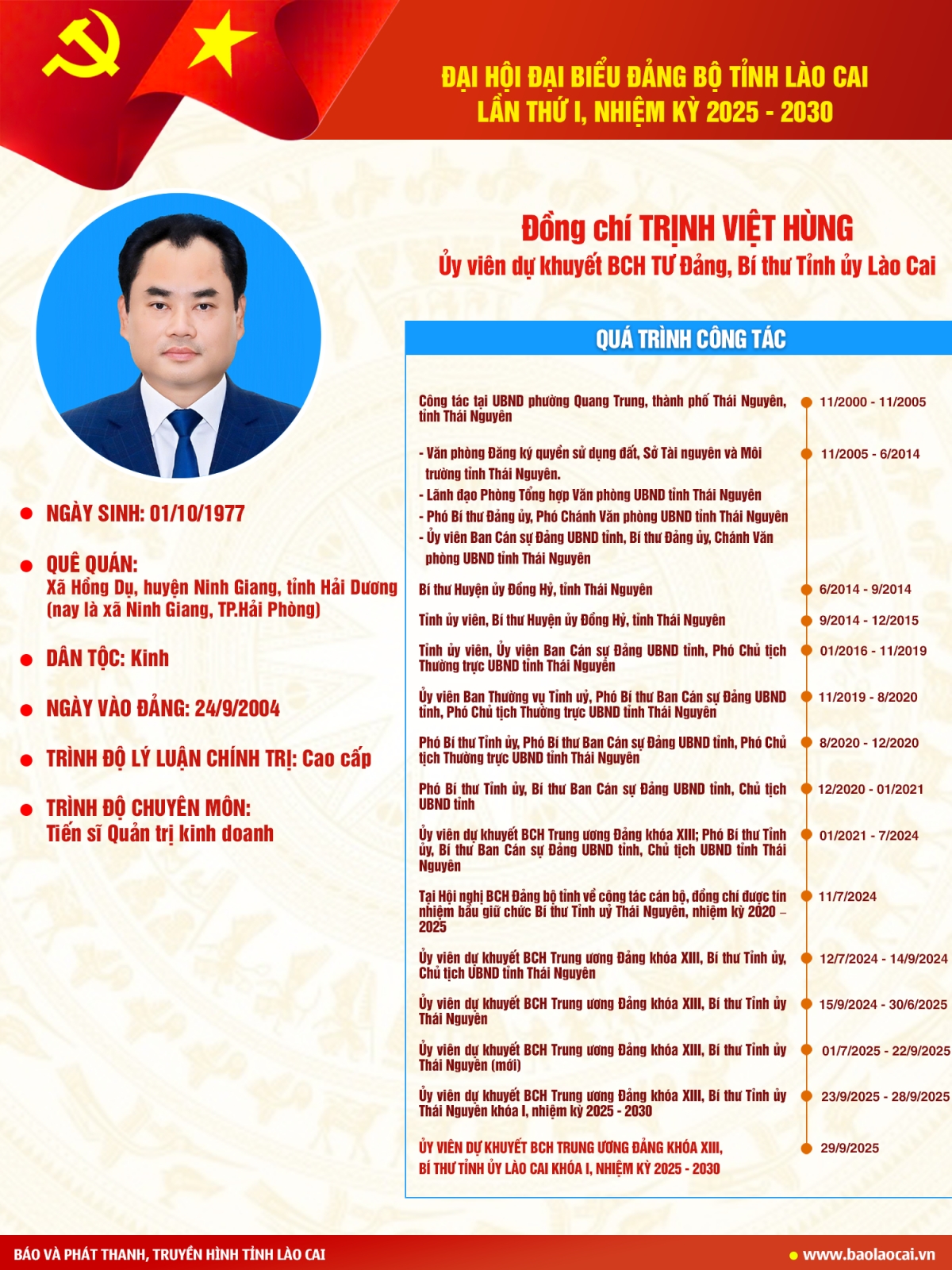 VOV.VN - Tại phiên chính thức Đại hội đại biểu Đảng bộ tỉnh Lào Cai lần thứ I, nhiệm kỳ 2025-2030, thay mặt Bộ Chính trị, ông Phan Thăng An, Phó trưởng Ban Tổ chức Trung ương đã công bố các Quyết định về công tác cán bộ tại địa phương. Ông Trịnh Việt Hùng, Ủy viên dự khuyết Ban Chấp hành Trung ương Đảng giữ chức Bí thư Tỉnh ủy.