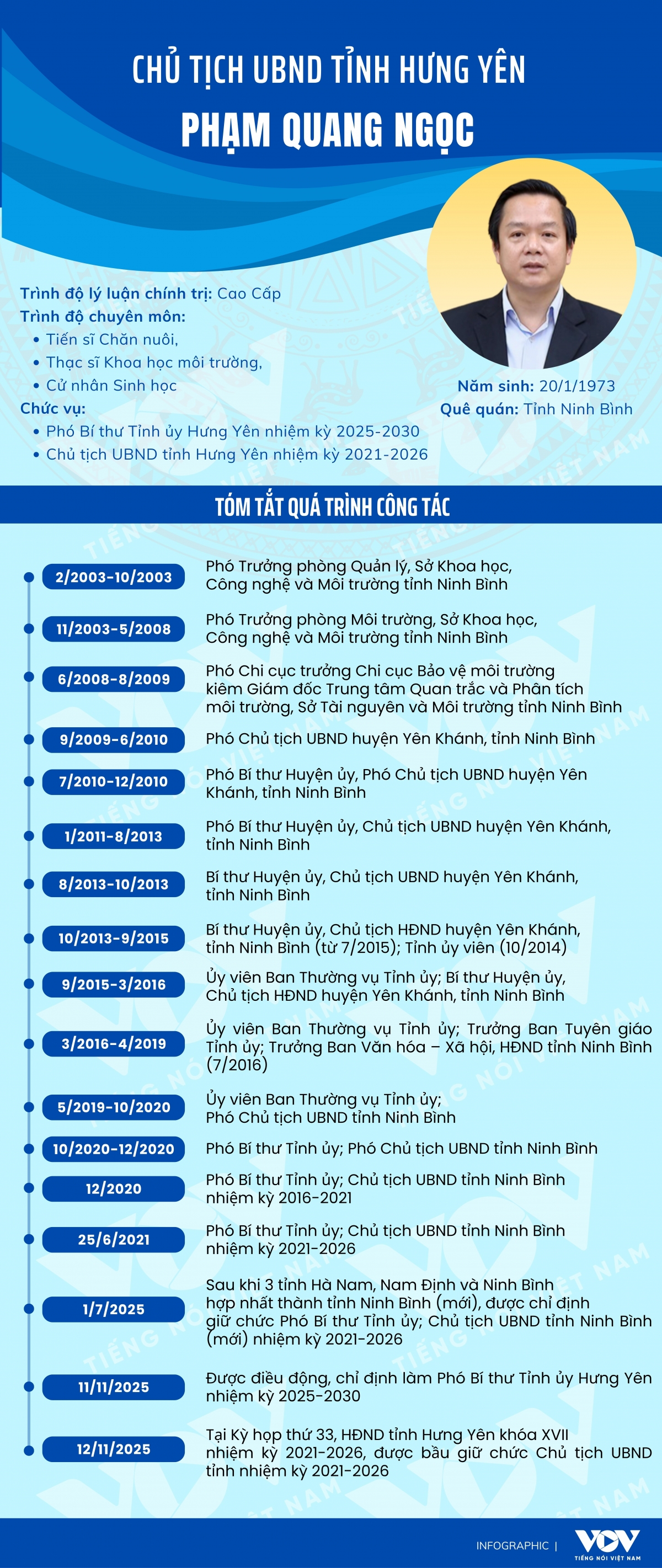 VOV.VN -Tại Kỳ họp thứ 33, HĐND tỉnh Hưng Yên khóa XVII nhiệm kỳ 2021-2026 đã bầu ông Phạm Quang Ngọc, Phó Bí thư Tỉnh ủy Hưng Yên, làm Chủ tịch UBND tỉnh Hưng Yên nhiệm kỳ 2021-2026.