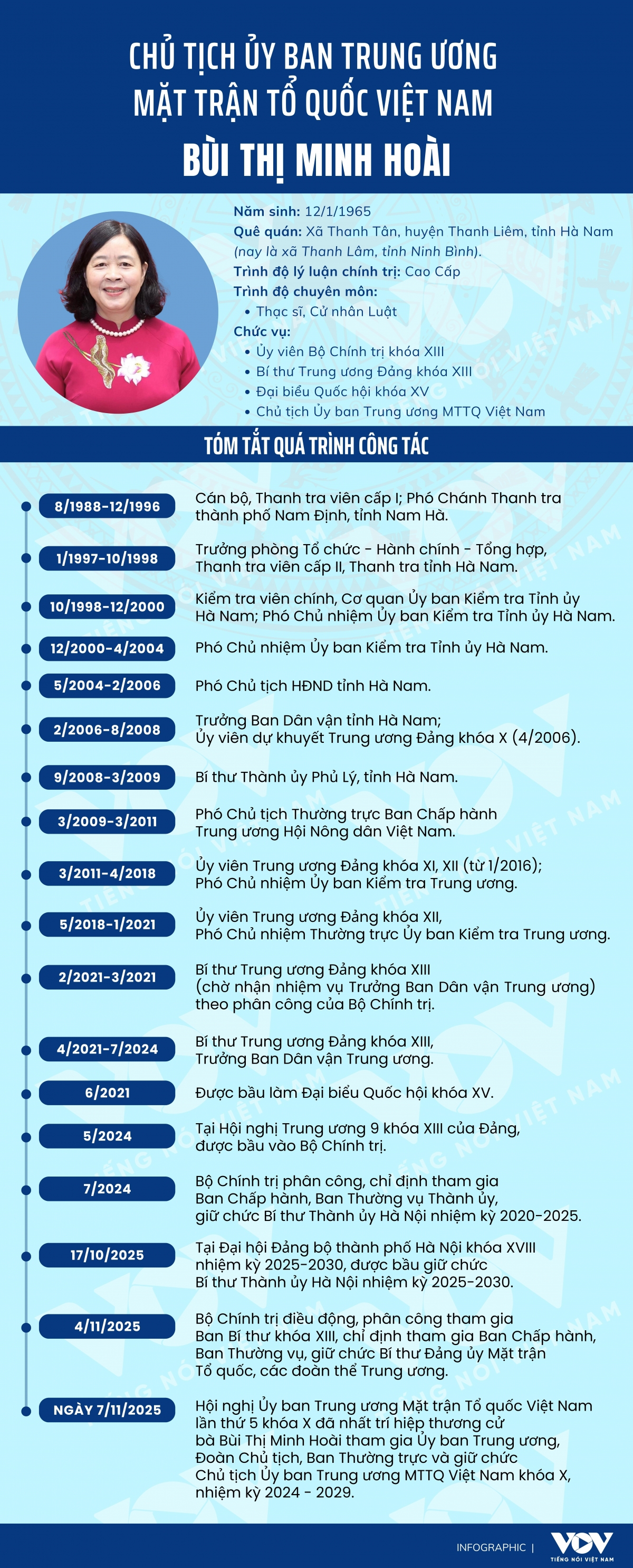 VOV.VN - Bà Bùi Thị Minh Hoài được hiệp thương cử giữ chức Chủ tịch Ủy ban Trung ương MTTQ Việt Nam khóa X, nhiệm kỳ 2024 - 2029, trở thành nữ Chủ tịch Ủy ban Trung ương MTTQ Việt Nam đầu tiên.