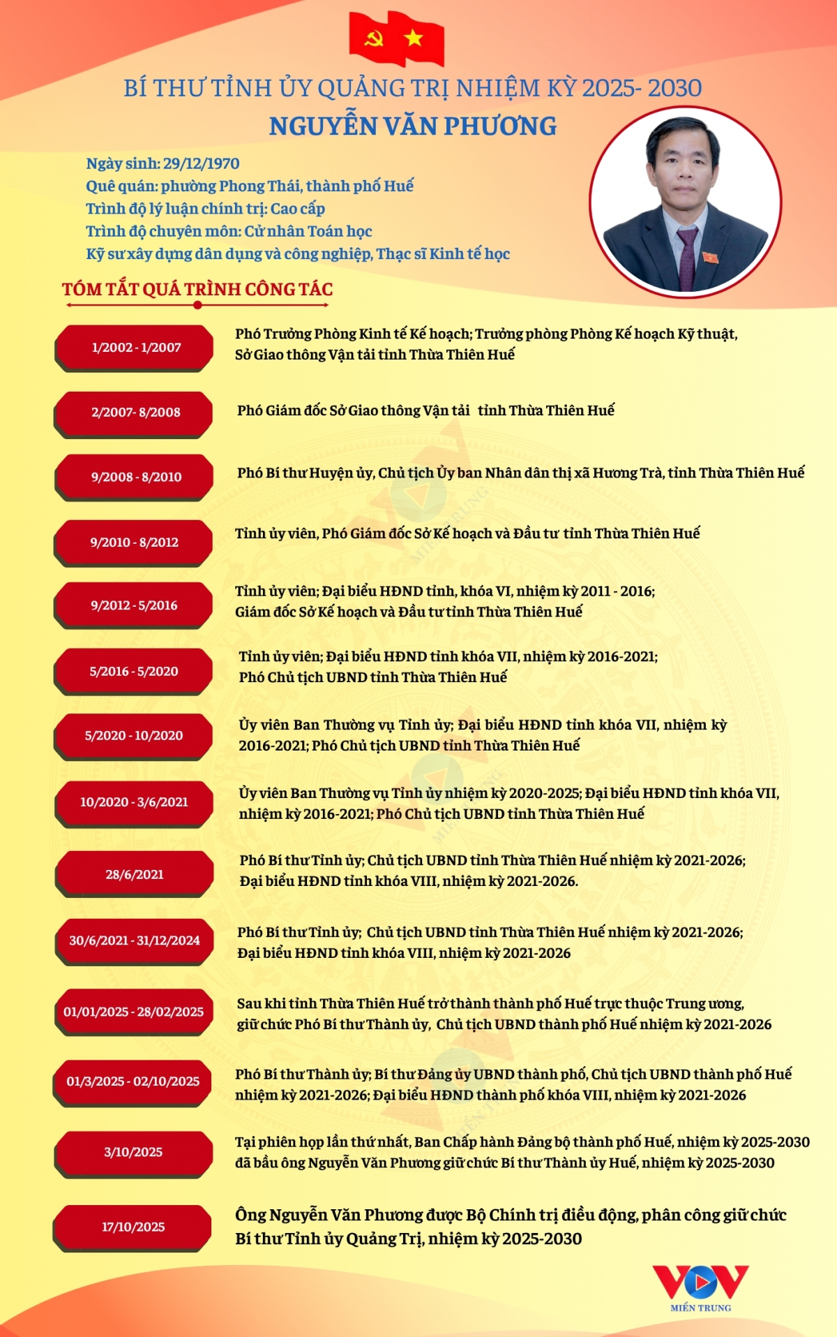 VOV.VN - Theo quyết định của Bộ Chính trị, ông Nguyễn Văn Phương thôi tham gia Ban Chấp hành, Ban Thường vụ Thành ủy Huế nhiệm kỳ 2025-2030; Điều động, chỉ định ông Nguyễn Văn Phương tham gia Ban Chấp hành, Ban Thường vụ Tỉnh ủy Quảng Trị và giữ chức Bí thư Tỉnh ủy Quảng Trị nhiệm kỳ 2025-2030.
