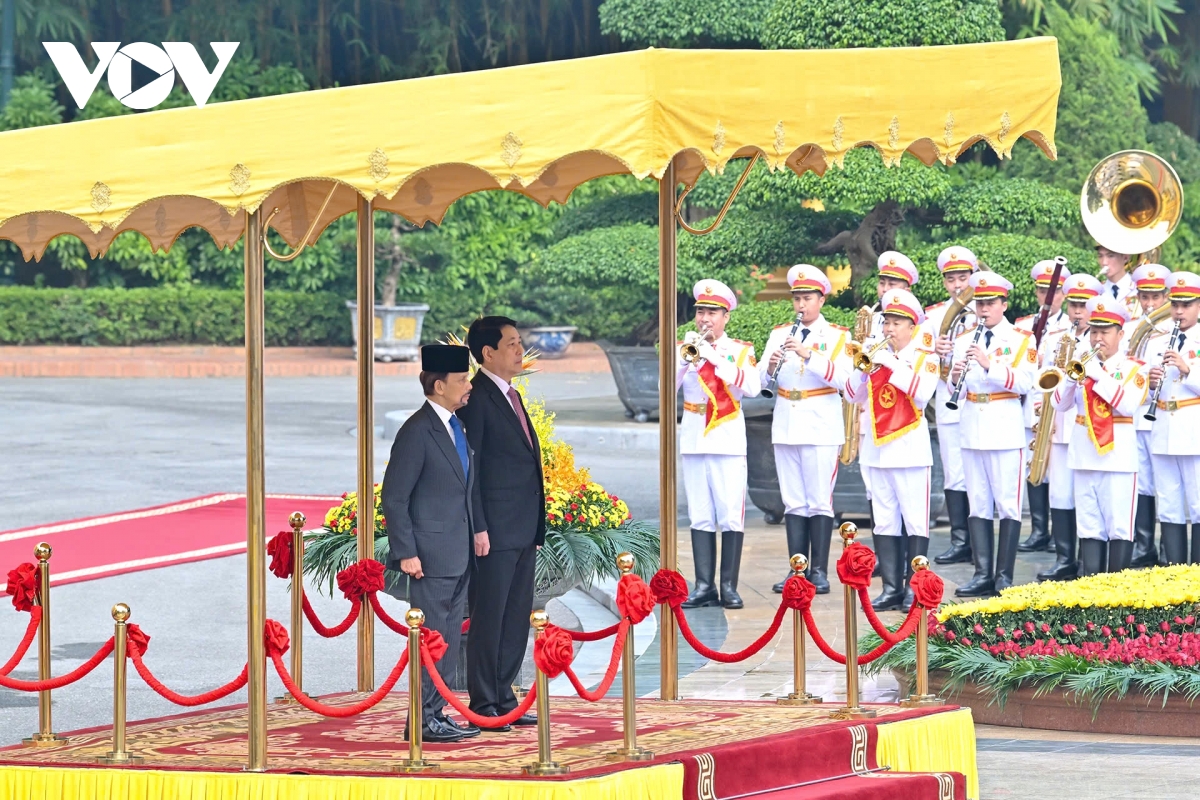 VOV.VN - Sáng 1/12, tại Phủ Chủ tịch, Chủ tịch nước Lương Cường chủ trì lễ đón chính thức Quốc vương Brunei Haji Hassanal Bolkiah thăm cấp Nhà nước tới Việt Nam.