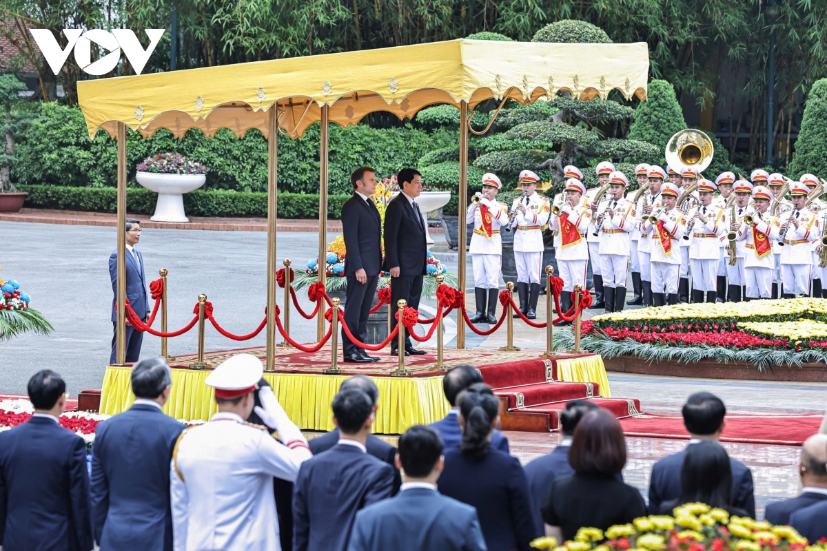 Chủ trì lễ đón với nghi thức cao nhất dành cho nguyên thủ quốc gia, Chủ tịch nước Lương cường mời Tổng thống Emmanuel Macron bước lên bục danh dự. Quân nhạc cử Quốc thiều hai nước.