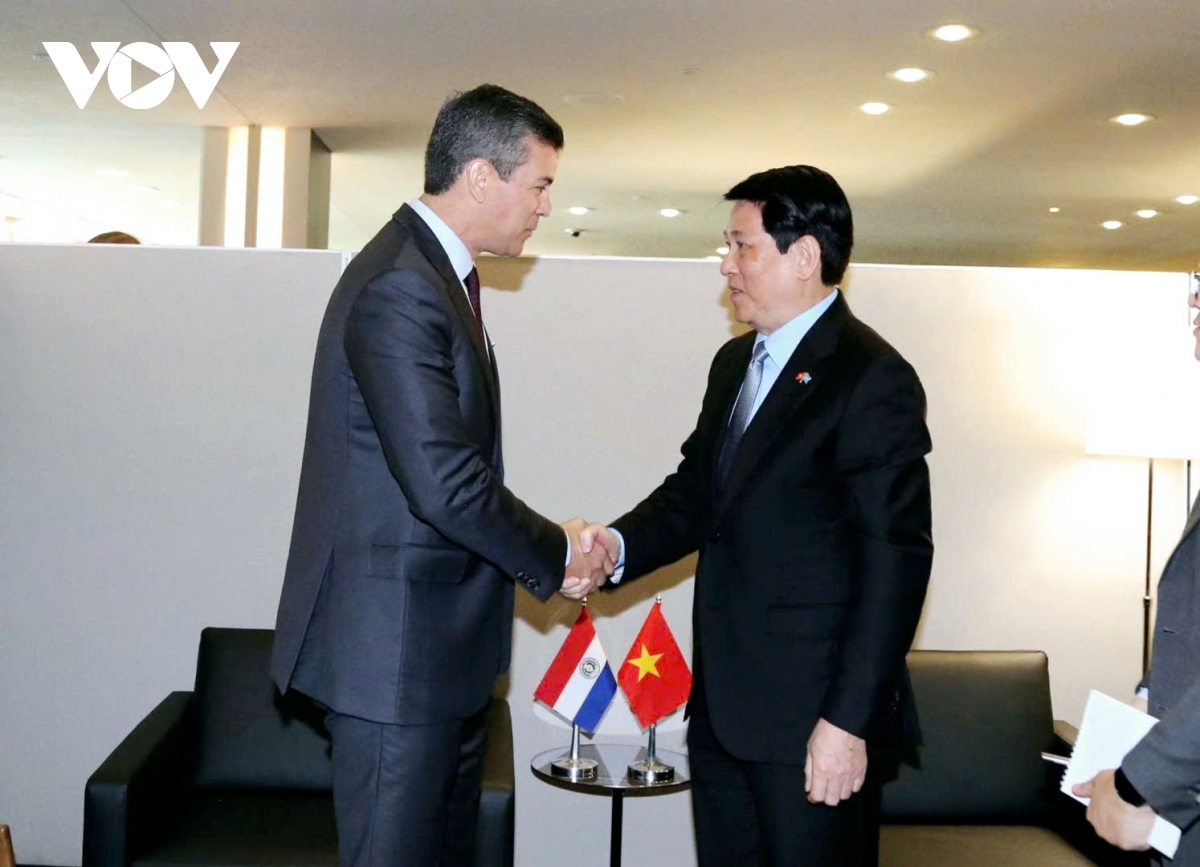 VOV.VN - Trong khuôn khổ tham dự Phiên Thảo luận chung cấp cao Đại hội đồng Liên Hợp Quốc (LHQ) Khóa 80, kết hợp hoạt động song phương tại Hoa Kỳ, ngày 22/9, tại New York, Chủ tịch nước Lương Cường đã gặp Tổng thống Paraguay Santiago Peña Palacios.