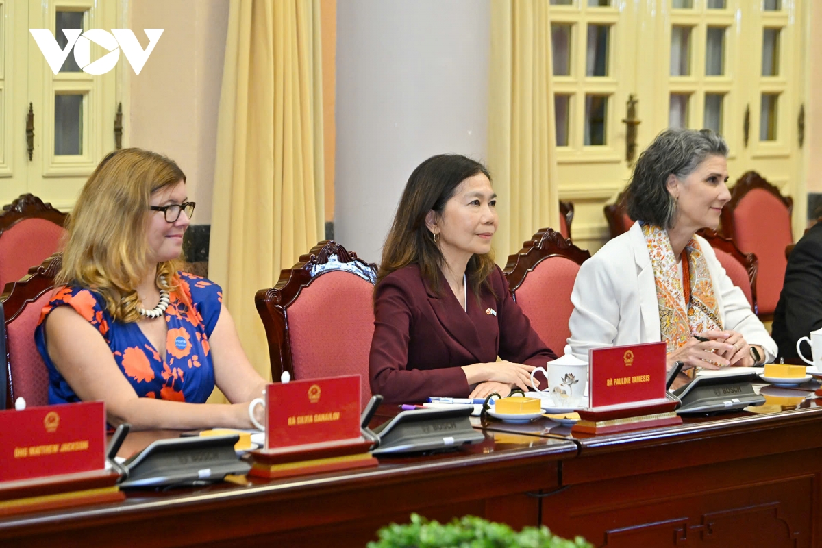 Chủ tịch nước Lương Cường và Điều phối viên thường trú Liên Hợp Quốc tại Việt Nam Pauline Tamesis.