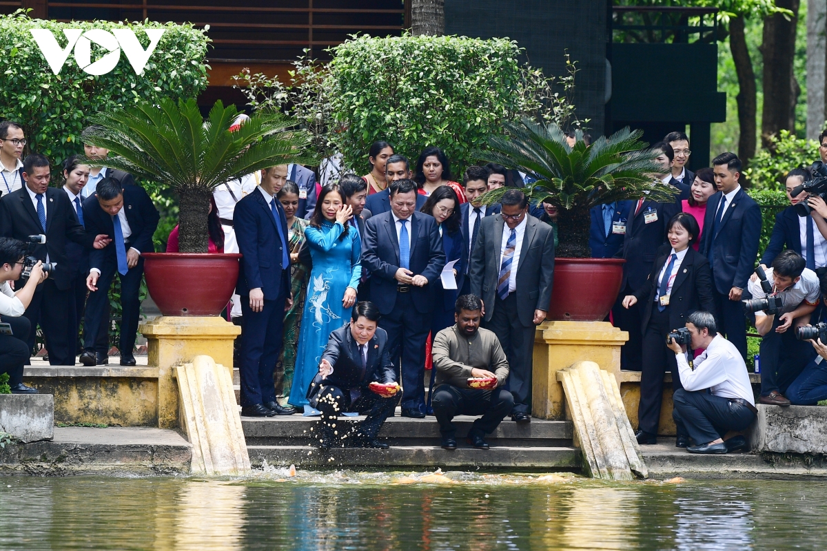 Chủ tịch nước Lương Cường cùng Tổng thống Anura Kumara Dissanayaka cho cá ăn tại Ao cá Bác Hồ.