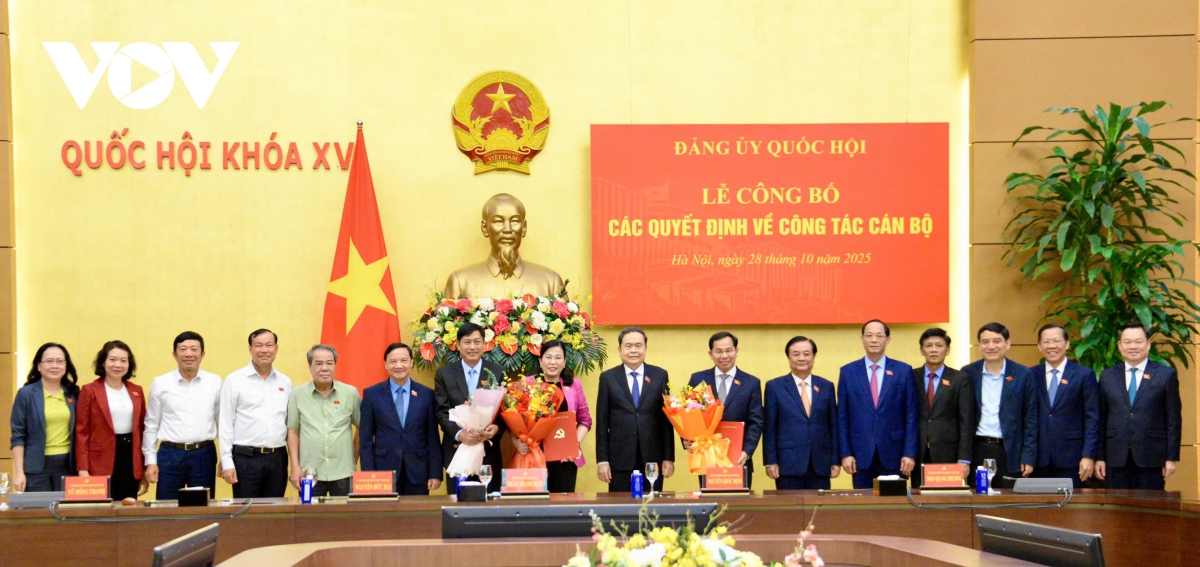 VOV.VN - Chiều tối nay (28/10), tại Nhà Quốc hội, Bí thư Đảng ủy Quốc hội, Chủ tịch Quốc hội Trần Thanh Mẫn đã dự Lễ công bố các quyết định về công tác cán bộ của Ban Thường vụ Đảng ủy Quốc hội.