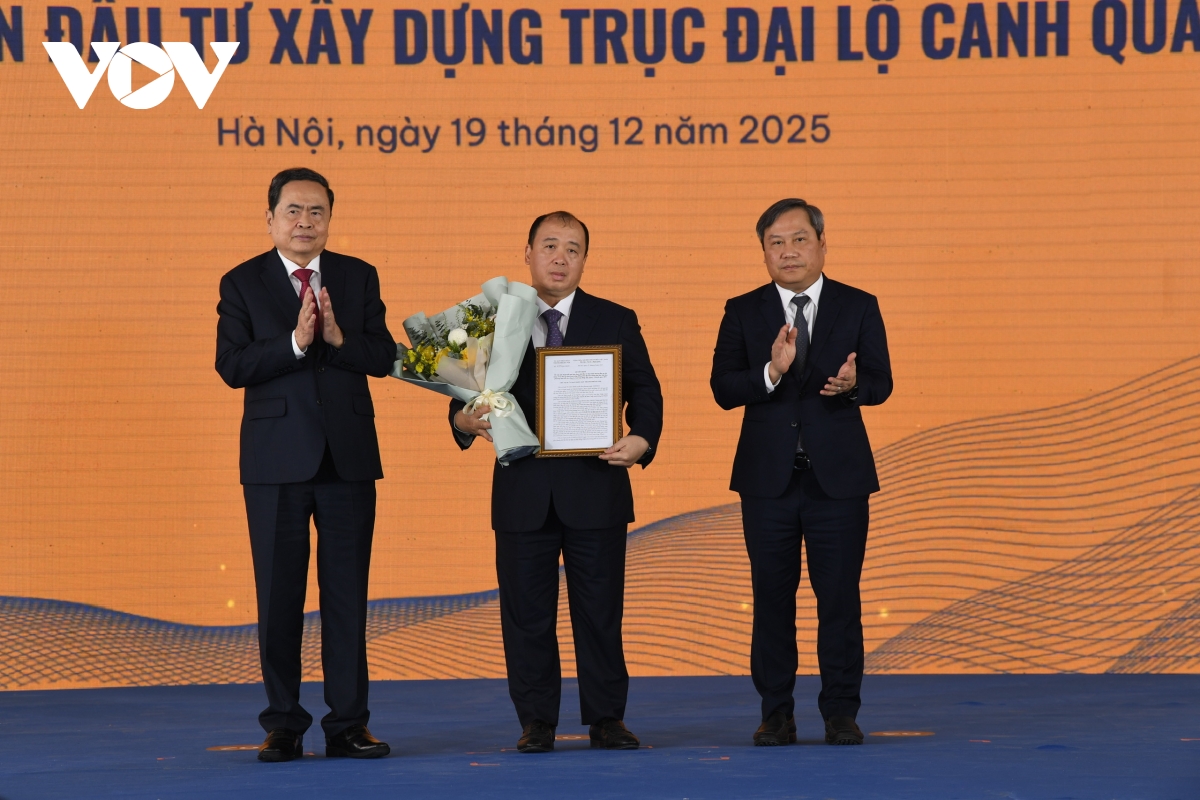 VOV.VN - Hòa chung với Lễ khởi công, khánh thành, thông xe kỹ thuật các dự án, công trình chào mừng Đại hội Đại biểu toàn quốc lần thứ XIV của Đảng, sáng 19/12, tại phường Phú Thượng, TP Hà Nội đã diễn ra Lễ khởi công Dự án Đầu tư xây dựng Trục Đại lộ Cảnh quan sông Hồng. Chủ tịch Quốc hội Trần Thanh Mẫn dự lễ.