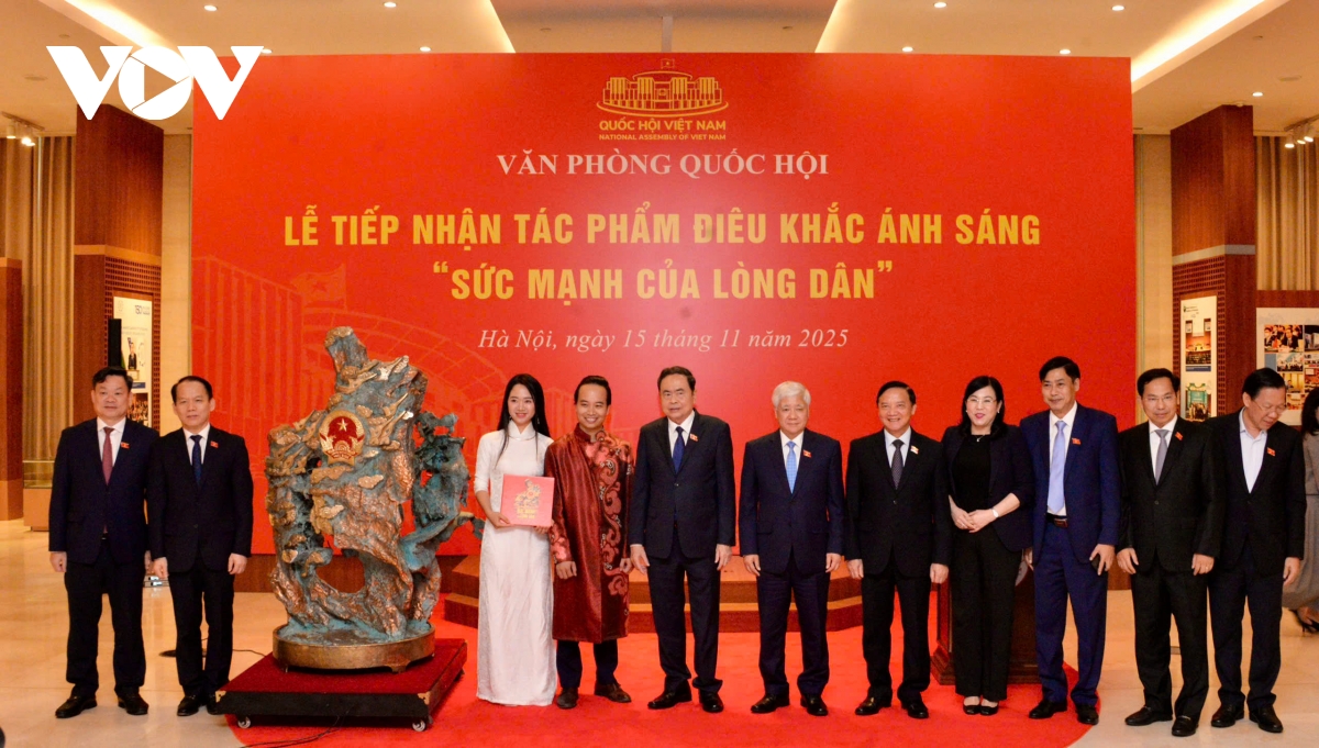 Hướng tới kỷ niệm 80 năm Quốc hội Việt Nam (6/1/1946 - 6/1/2026); chào mừng kỳ họp thứ 10, Quốc hội khóa XV và chuẩn bị khai trương Bảo tàng Quốc hội Việt Nam, chiều nay (15/11), Văn phòng Quốc hội tổ chức lễ tiếp nhận tác phẩm điêu khắc ánh sáng “Sức mạnh của lòng dân” do nghệ nhân Bùi Văn Tự trao tặng Bảo tàng Quốc hội Việt Nam. Chủ tịch Quốc hội Trần Thanh Mẫn dự lễ tiếp nhận.