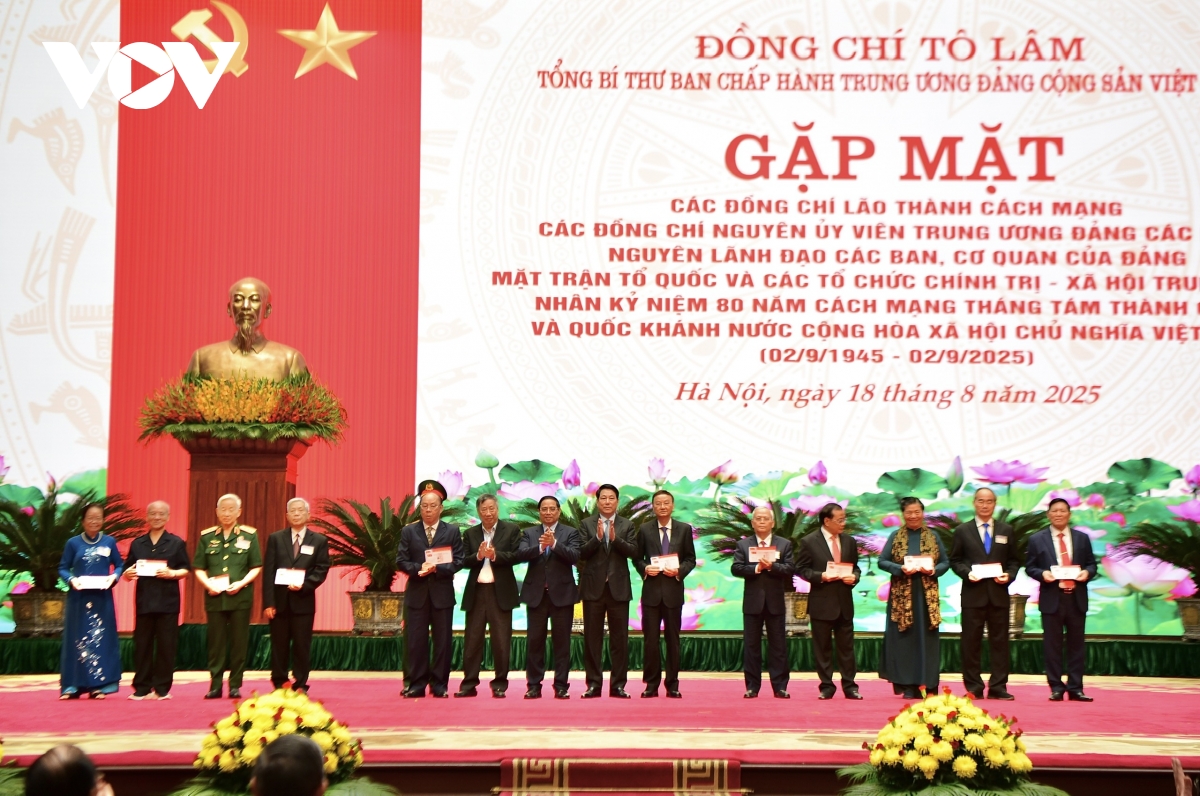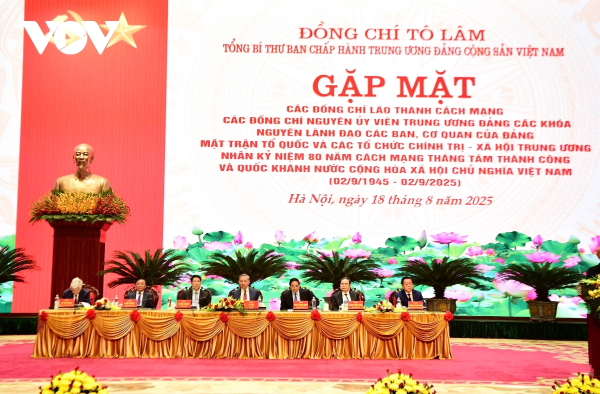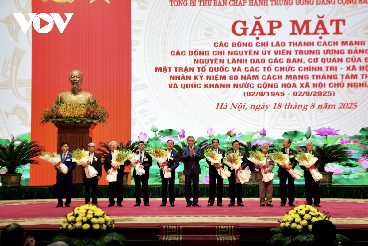 VOV.VN - Sáng 18/8, Tổng Bí thư Tô Lâm chủ trì buổi gặp mặt các đồng chí lão thành cách mạng, nguyên Uỷ viên Trung ương Đảng các khoá, nguyên lãnh đạo các Ban, cơ quan của Đảng, Mặt trận Tổ quốc Việt Nam và các tổ chức chính trị - xã hội Trung ương.