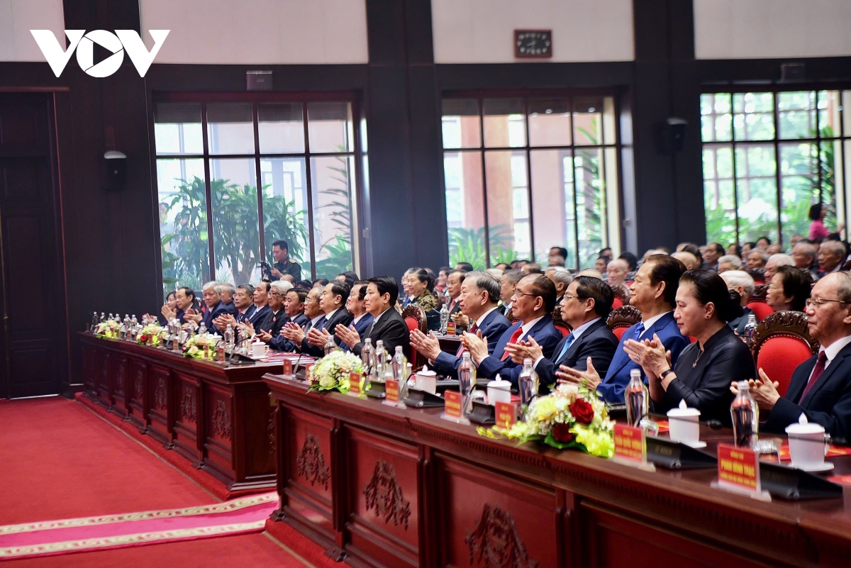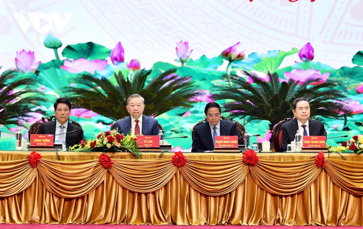 Tổng Bí thư Tô Lâm và các lãnh đạo Đảng, Nhà nước chủ trì buổi gặp mặt.