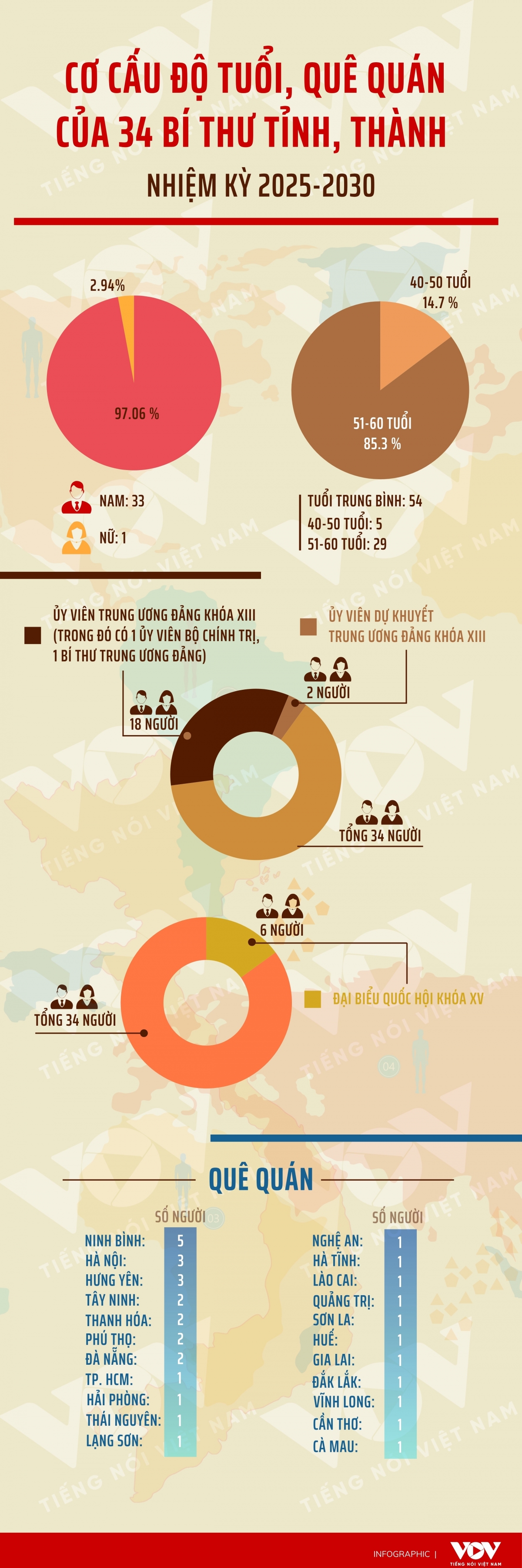 VOV.VN - Độ tuổi trung bình của 34 bí thư tỉnh, thành nhiệm kỳ 2025-2030 là 54 tuổi. Họ đều không phải người địa phương, 18 người là Ủy viên Trung ương Đảng khóa XIII (trong đó có 1 Ủy viên Bộ Chính trị, 1 Bí thư Trung ương Đảng), 2 Ủy viên dự khuyết Trung ương Đảng khóa XIII.