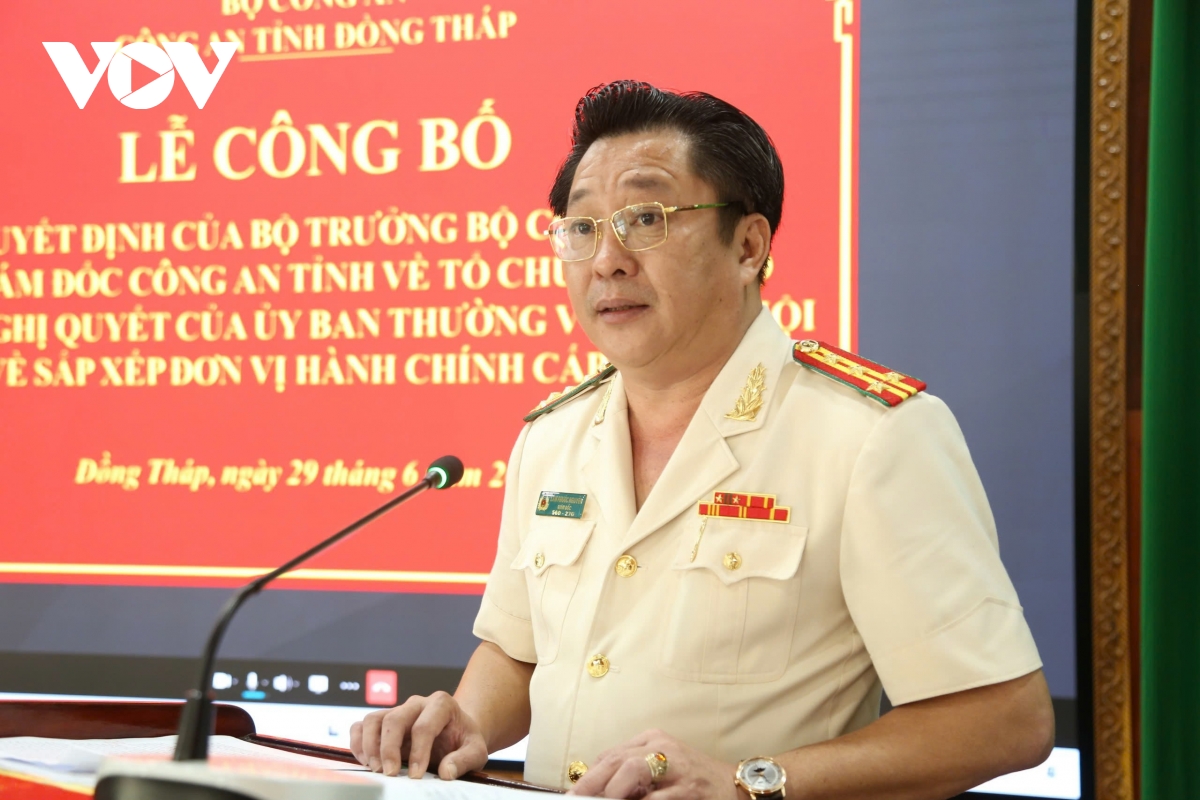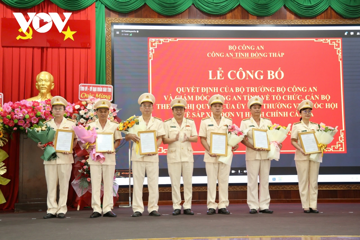 Tại buổi lễ đã công bố Quyết định của Bộ trưởng Bộ công an về việc sáp nhập Công an tỉnh Tiền Giang và các tổ chức trực thuộc vào Công an tỉnh Đồng Tháp (cũ) về việc điều động cán bộ, bố trí cán bộ và thành lập công an cấp xã, quy định tổ chức bộ máy của các đơn vị thuộc Công an tỉnh Đồng Tháp (mới).