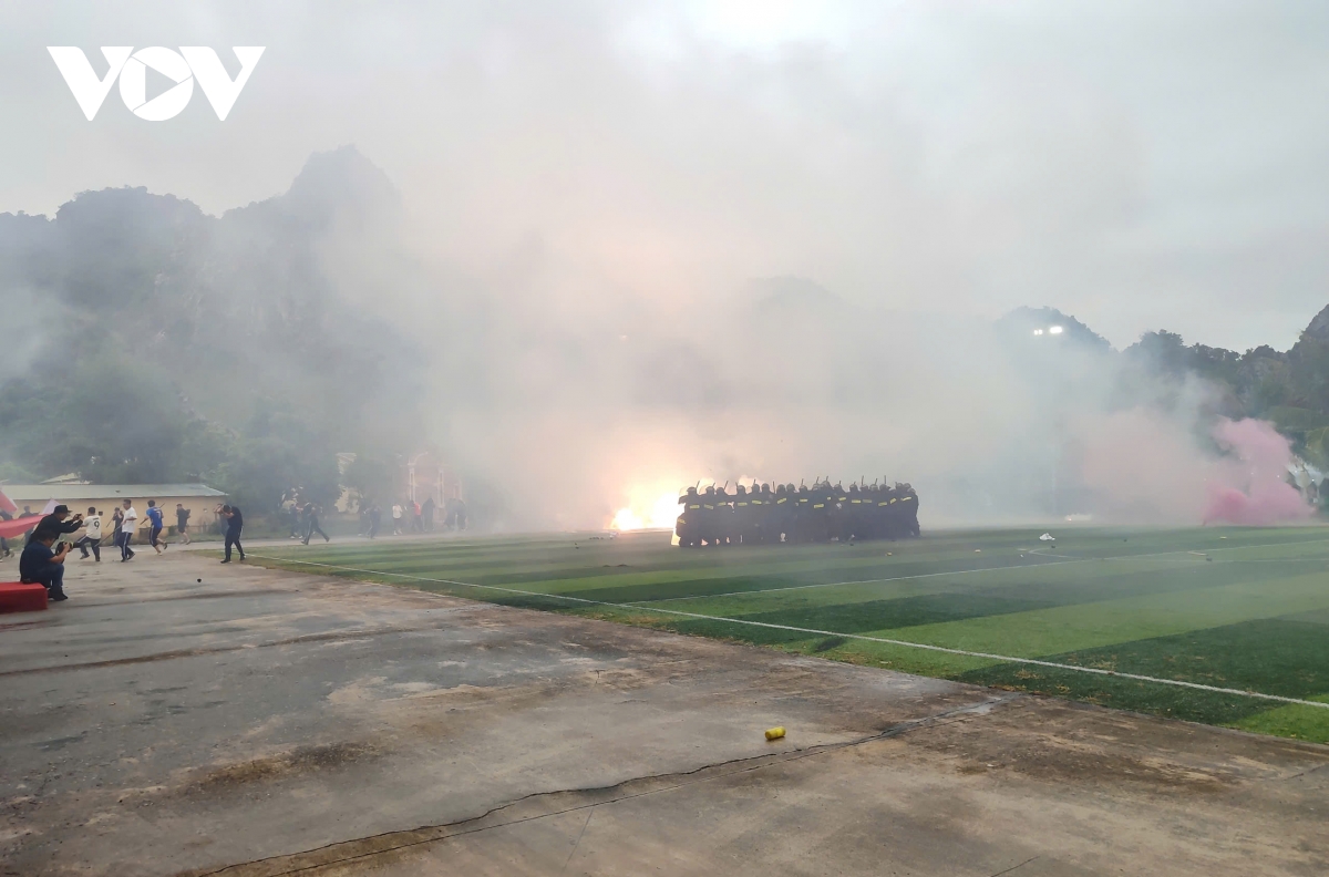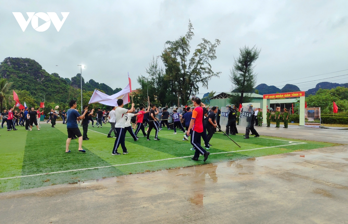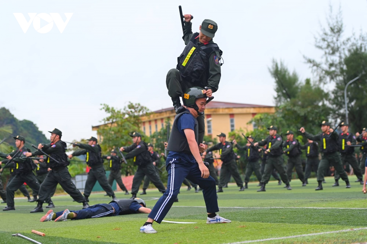 Tại Lễ báo cáo kết quả công tác huấn luyện lực lượng Cảnh sát cơ động năm 2025, khoảng 300 chiến sĩ cảnh sát cơ động Công an tỉnh Quảng Ninh thực hành các nội dung huấn luyện như phân thế bài võ Mai Hoa Quyền, bài quyền Tônfa...