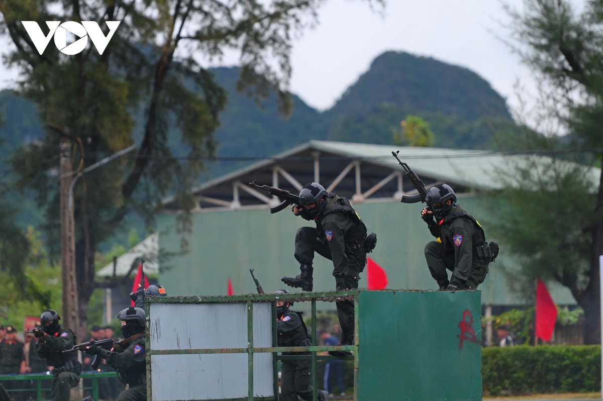 Bên cạnh đó, các chiến sĩ cũng biểu diễn chiến thuật cảnh sát cơ động đội hình giải tán đám đông, gây rối an ninh trật tự, biểu tình bạo loạn, đối tượng khủng bố, giải cứu con tin trên phương tiện giao thông.