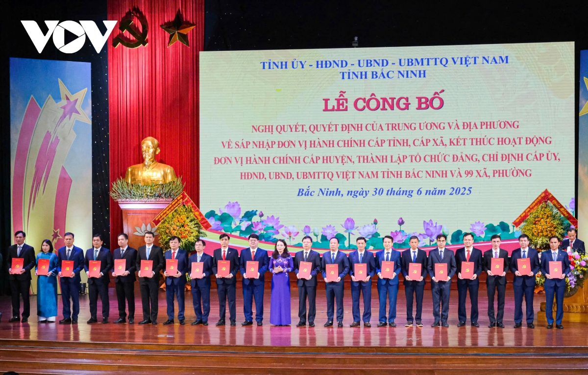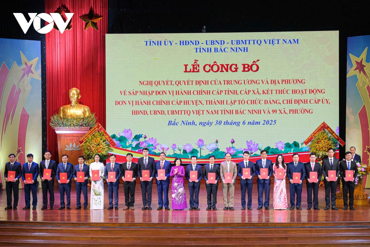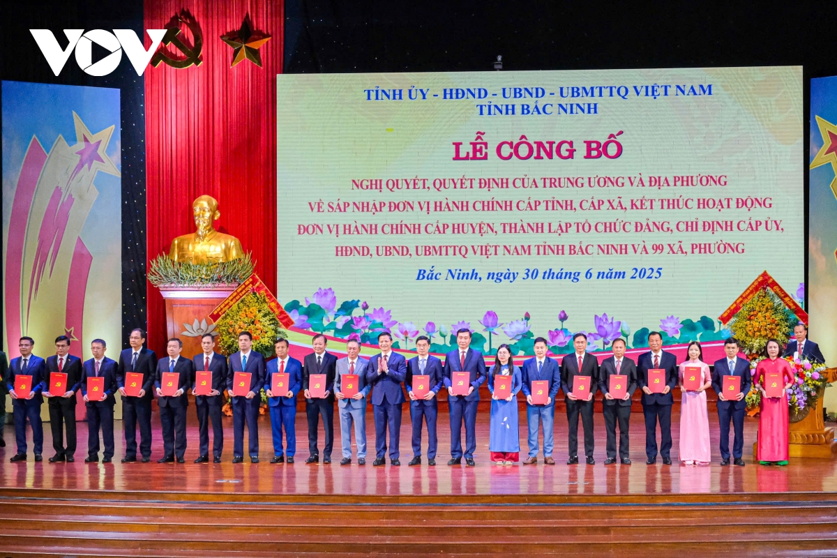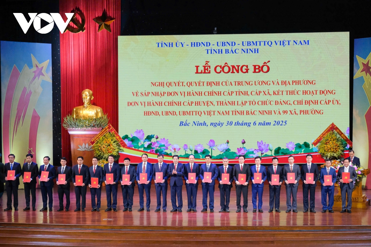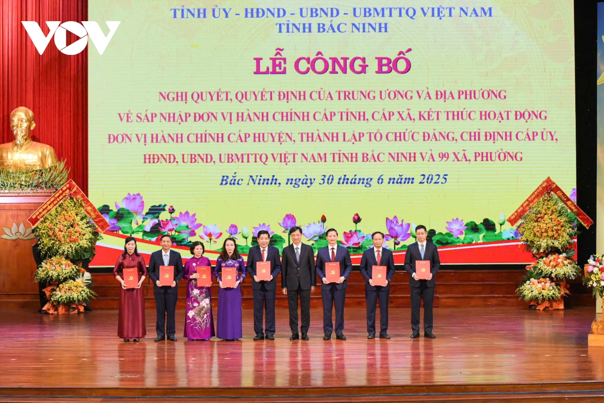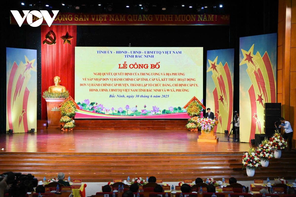 Ngày 30/6, tại Trung tâm hội nghị tỉnh Bắc Ninh (mới) tổ chức trọng thể lễ công bố nghị quyết, quyết định của Trung ương và địa phương về sáp nhập đơn vị hành chính cấp tỉnh, cấp xã, kết thúc hoạt động đơn vị hành chính cấp huyện, thành lập tổ chức đảng, chỉ định cấp ủy, HĐND, UBND, Ủy ban MTTQ tỉnh Bắc Ninh và 99 xã, phường.