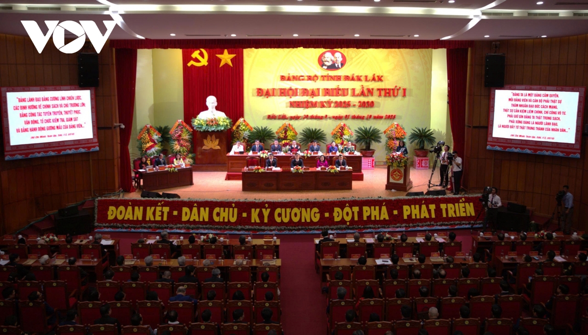 VOV.VN - Sáng 30/9, Đại hội đại biểu Đảng bộ tỉnh Đắk Lắk lần thứ I, nhiệm kỳ 2025-2030 chính thức khai mạc với chủ dề “Đoàn kết - Dân chủ - Kỷ cương - Đột phá - Phát triển”. Đại hội có sự tham dự của 449 đại biểu, đại diện cho hơn 137.000 đảng viên toàn Đảng bộ.