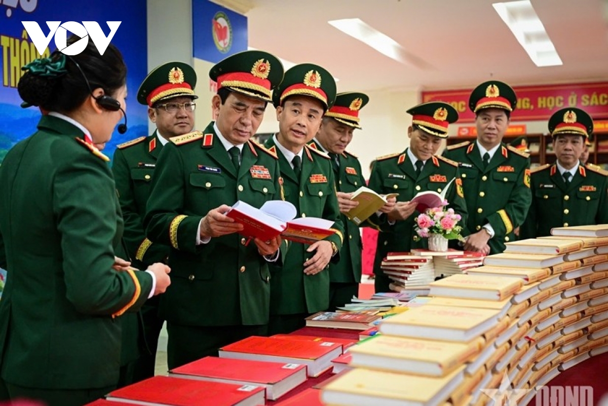 Đại tướng Phan Văn Giang tham quan khu trưng bày sách của Trường sĩ quan Chính trị.