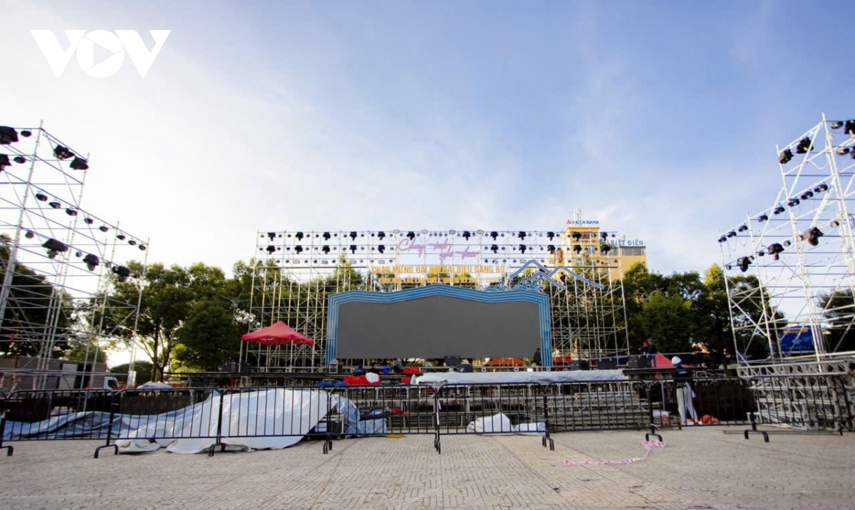Sân khấu lớn tại Quảng trường 10/3 - Nơi diễn ra chương trình văn nghệ chào mừng Đại hội đã gần hoàn tất