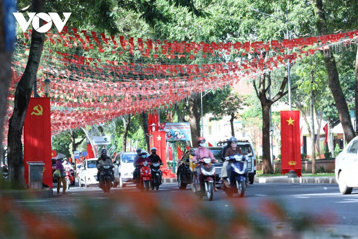 Cờ hoa rực rỡ trên đường Lê Duẩn, phường Buôn Ma Thuột, chào mừng Đại hội Đại biểu đảng bộ tỉnh Đắk Lắk lần thứ I