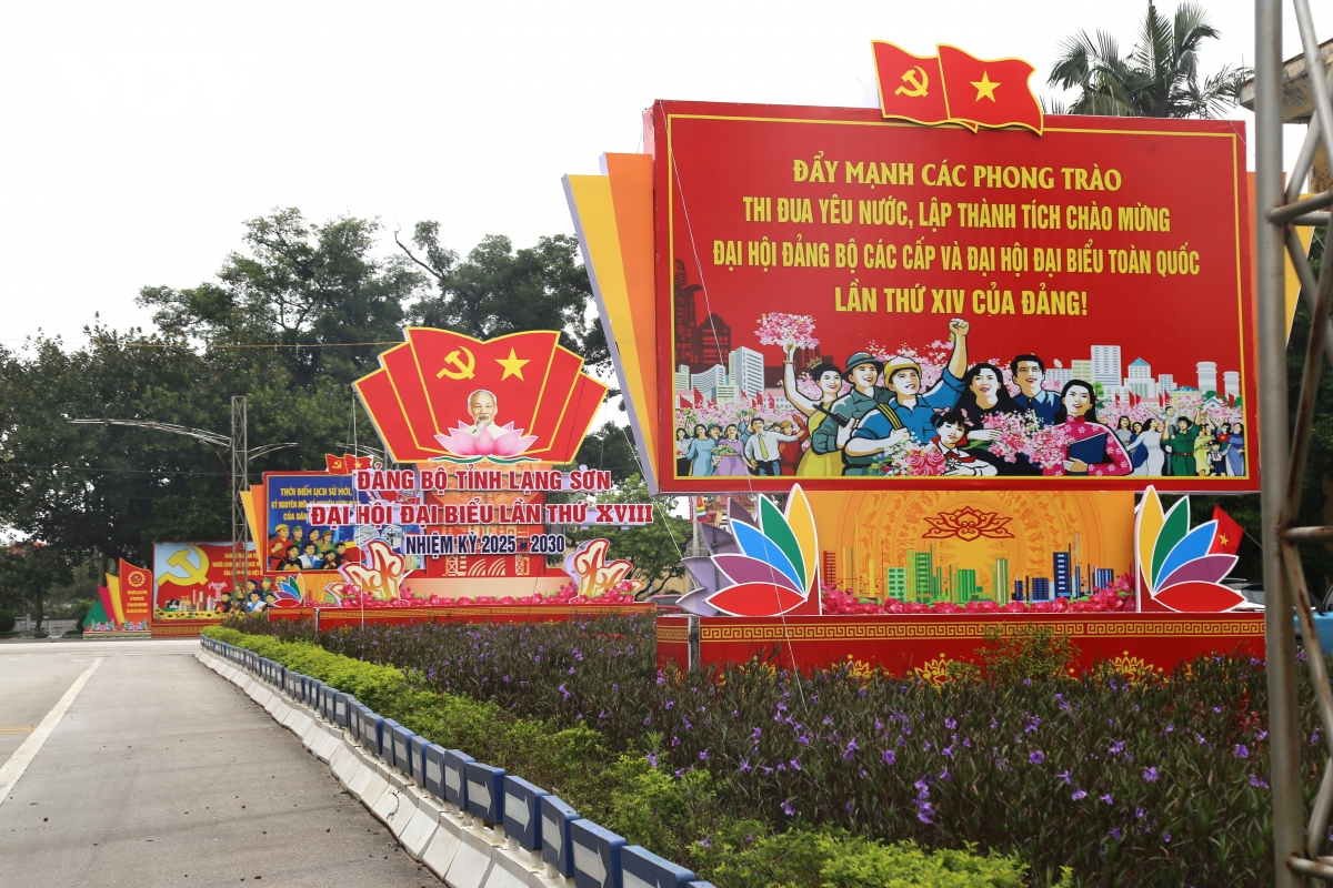 Đường phố Lạng Sơn khoác lên mình màu áo mới, rực rỡ với cờ, hoa, biểu ngữ, pano áp phích với nội dung tuyên truyền về Đại hội Đảng bộ tỉnh lần thứ XVIII, nhiệm kỳ 2025-2030