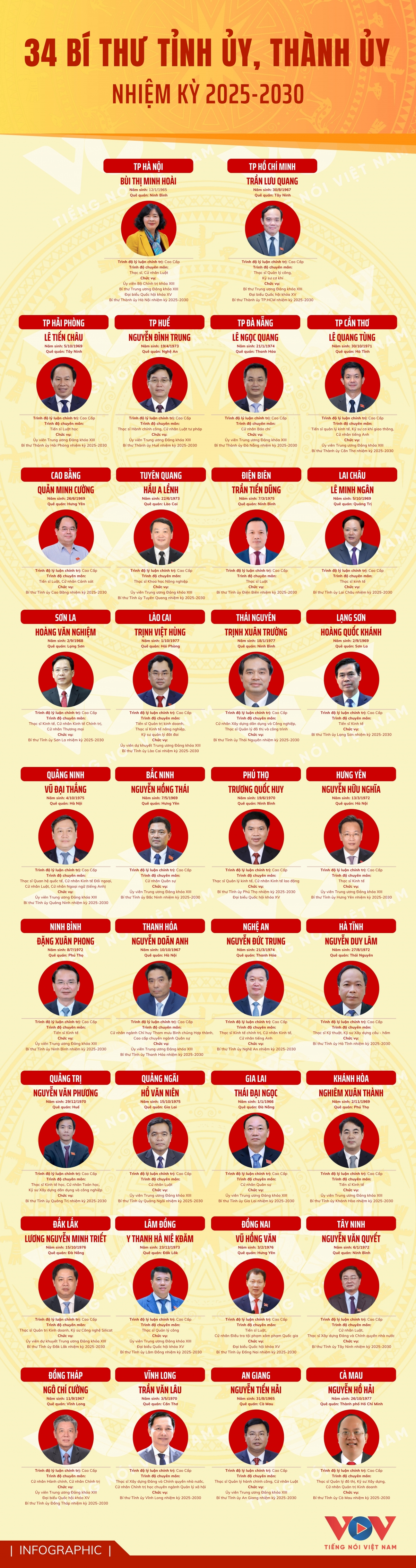 VOV.VN - Đến nay, 34 tỉnh, thành phố trên cả nước đã tổ chức thành công Đại hội đại biểu Đảng bộ cấp tỉnh nhiệm kỳ 2025-2030. Toàn bộ 34 bí thư tỉnh ủy, thành ủy đều không phải là người địa phương.