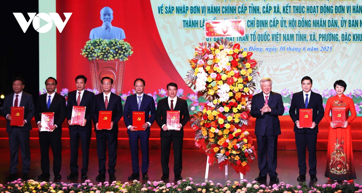 VOV.VN - Ngày 30/6, Tỉnh ủy, HĐND, UBND, Uỷ ban MTTQ tỉnh Đắk Lắk (mới) tổ chức Lễ Công bố Nghị quyết, Quyết định của Trung ương và địa phương về sáp nhập đơn vị hành chính cấp tỉnh, cấp xã, kết thúc hoạt động đơn vị hành chính cấp huyện, thành lập tổ chức Đảng, chỉ định cấp ủy, HĐND, UBND, MTTQ xã phường.