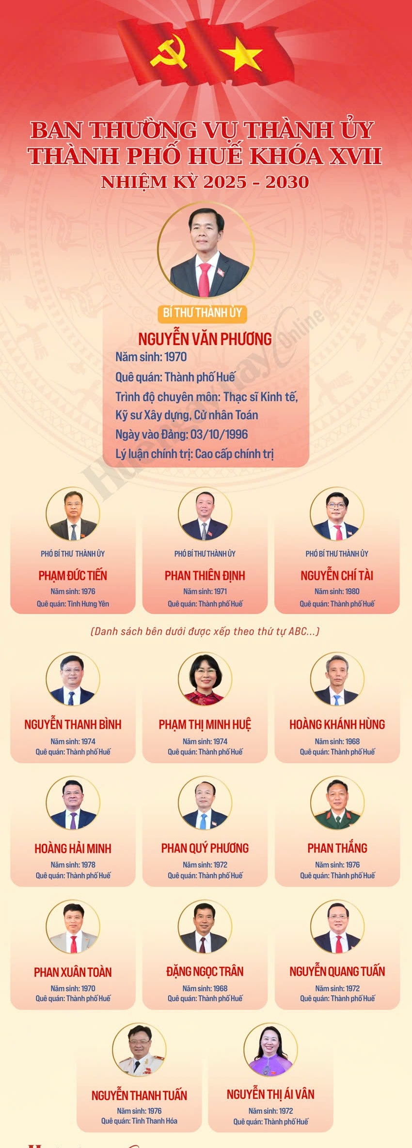 1. Ông Nguyễn Văn Phương, Phó Bí thư Thành ủy, Chủ tịch UBND Thành phố, giữ chức Bí thư Thành ủy Huế khóa XVII, nhiệm kỳ 2025-2030