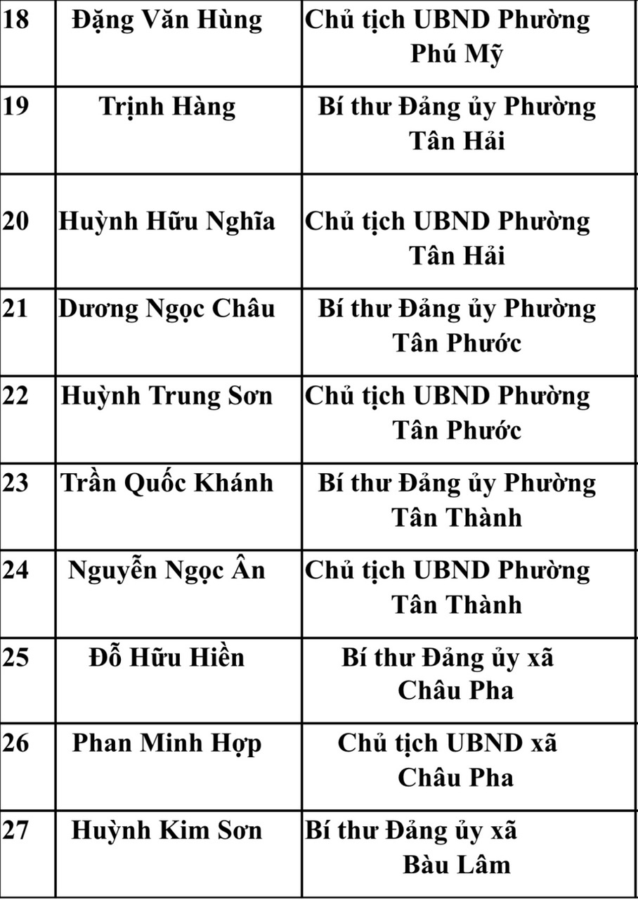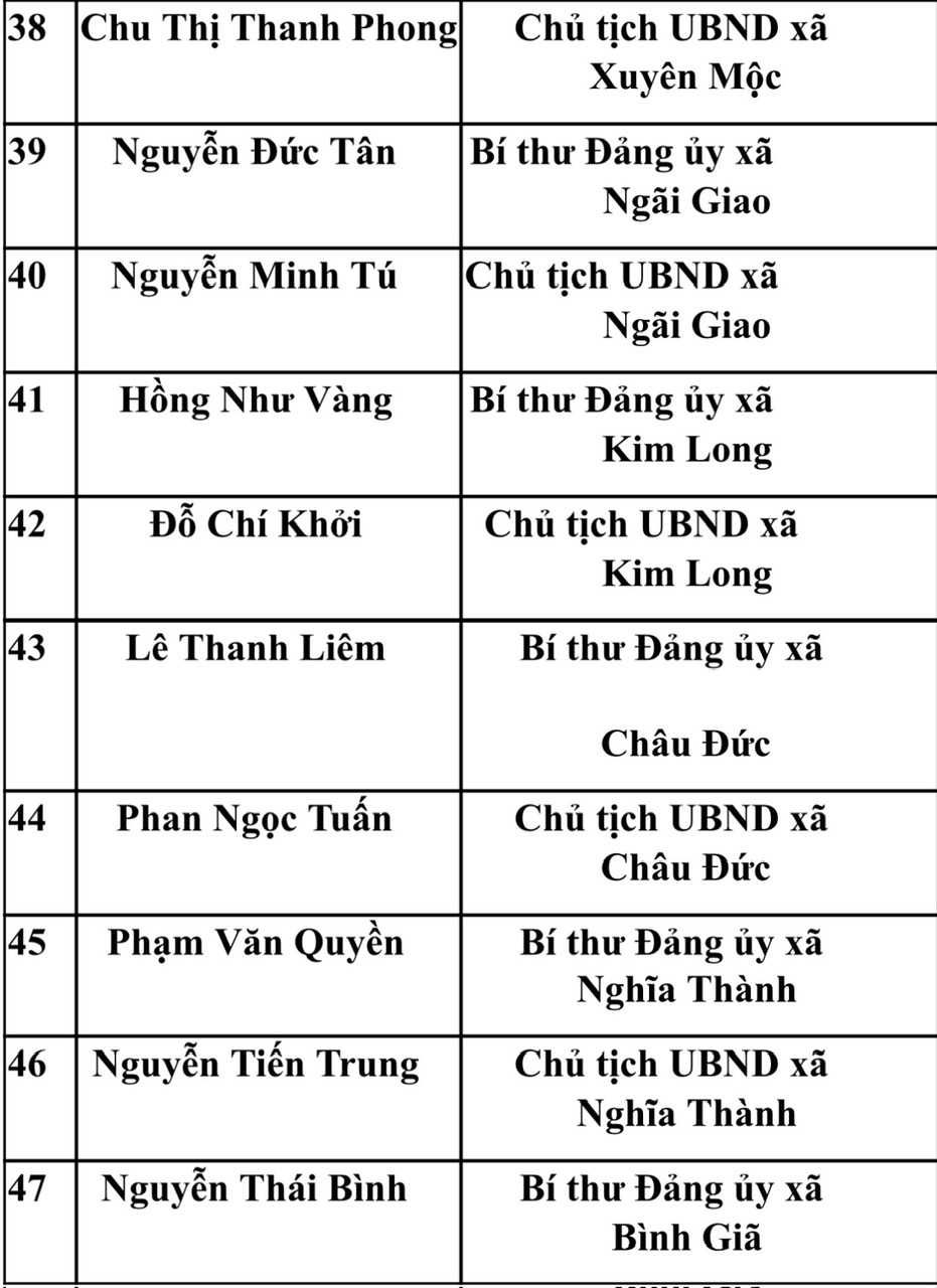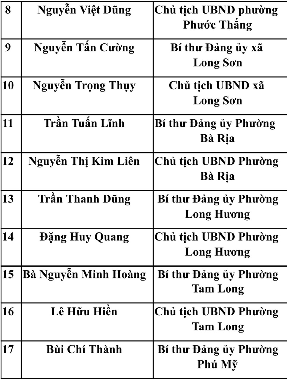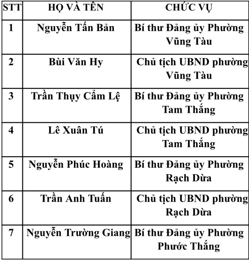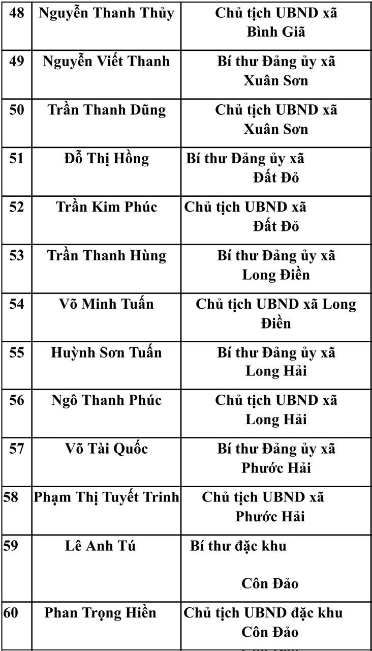 VOV.VN - Sau khi sáp nhập TP.HCM, Bình Dương, Bà Rịa – Vũng Tàu thành TP.HCM mới với 168 đơn vị hành chính cấp xã, trên địa bàn Bà Rịa – Vũng Tàu từ 77 phường xã sẽ giảm còn 30 phường, xã. Dưới đây là danh sách 30 bí thư, chủ tịch UBND phường, xã, đặc khu ở Bà Rịa – Vũng Tàu sau sáp nhập.