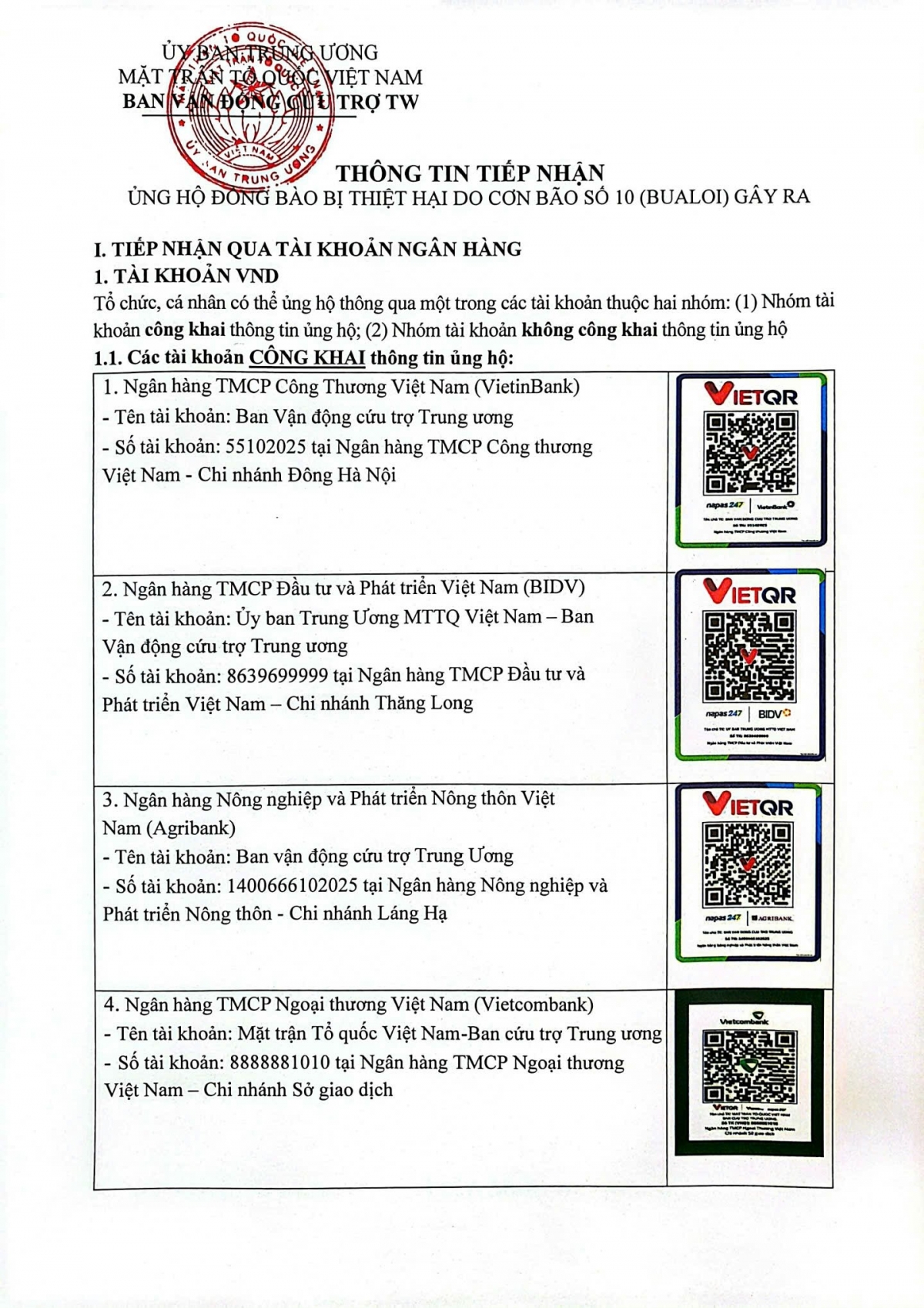 Thông tin về kết quả vận động ủng hộ đồng bào bị thiệt hại do thiên tai, bão lũ, ông Cao Xuân Thạo, Trưởng Ban Công tác xã hội Cơ quan Ủy ban Trung ương Mặt trận Tổ quốc (MTTQ) Việt Nam cho biết, hưởng ứng lời kêu gọi của Đoàn Chủ tịch Ủy ban Trung ương MTTQ Việt Nam, đã có rất nhiều cơ quan, doanh nghiệp, tổ chức, cá nhân ở trong và ngoài nước ủng hộ thông qua Ban Vận động Cứu trợ Trung ương.