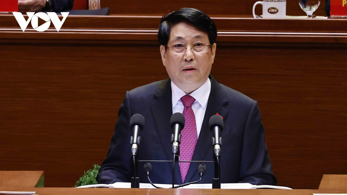 Ủy viên Bộ Chính trị, Chủ tịch nước Lương Cường trình bày Diễn văn khai mạc Đại hội. Ảnh: Ngọc Thành