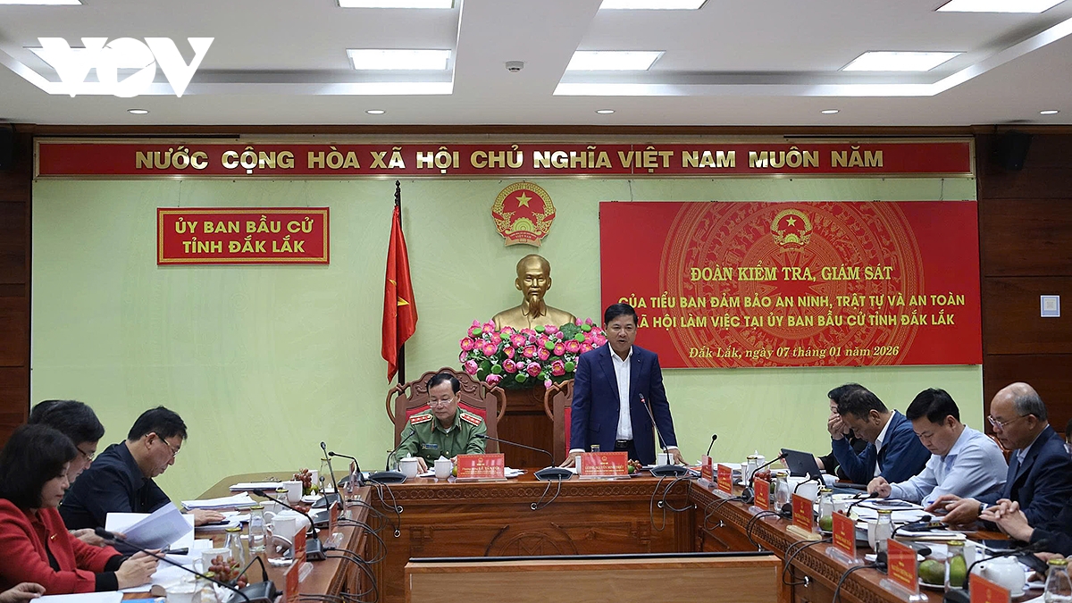 VOV.VN - Chiều 7/1, Đoàn kiểm tra, giám sát của Tiểu ban Đảm bảo an ninh, trật tự và đảm bảo an toàn xã hội thuộc Hội đồng Bầu cử Quốc gia đã làm việc tại Ủy ban Bầu cử (UBBC) tỉnh Đắk Lắk nhằm rà soát, đánh giá tình hình triển khai công tác bầu cử và các phương án bảo đảm an ninh, trật tự, an toàn xã hội trên địa bàn.