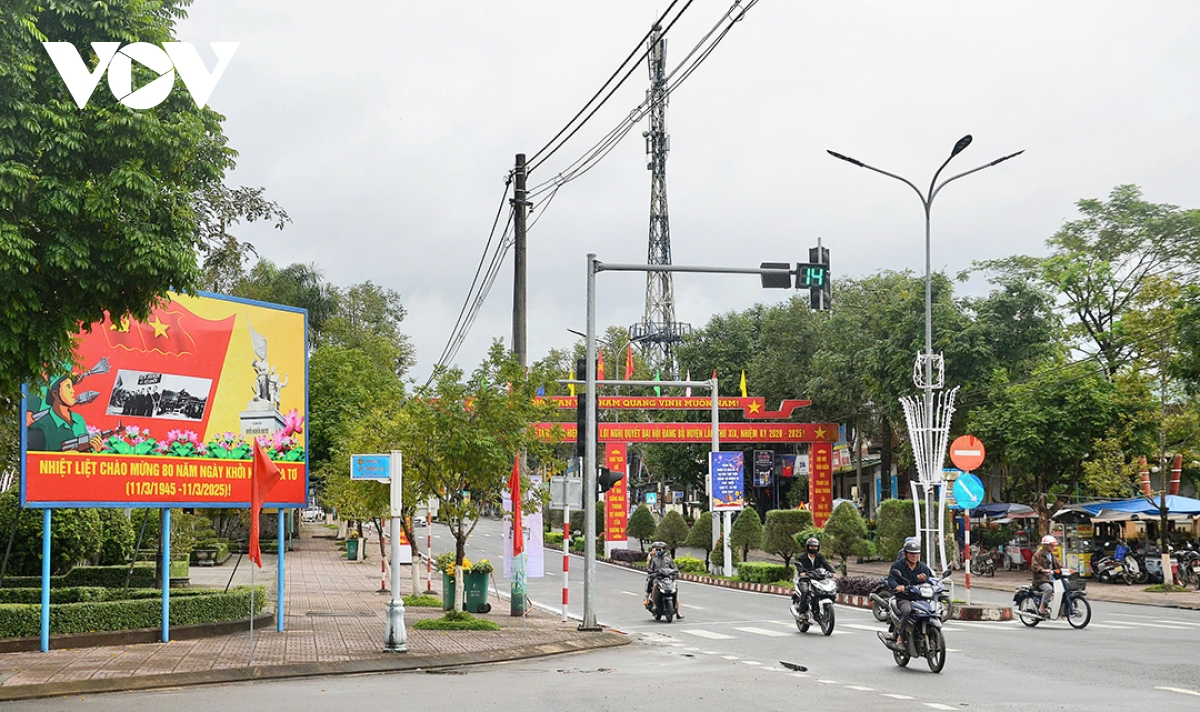 Trung tâm thị trấn Ba Tơ,tỉnh Quảng Ngãi đang được trang hoàng cờ hoa chuẩn bị cho Lễ Kỷ niệm 80 năm Ngày Khởi nghĩa Ba Tơ (11/3/1945-11/3/2025)