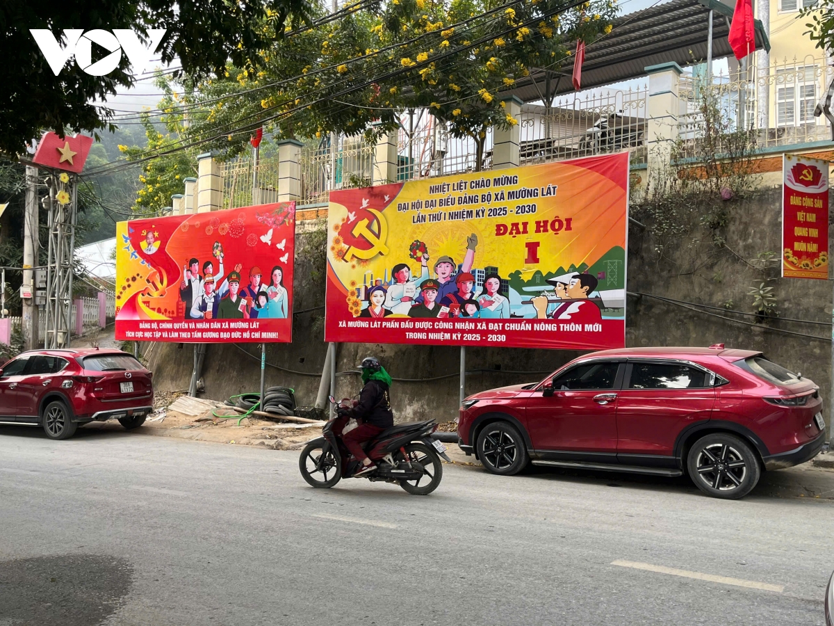 Trên các trục đường chính, khu trung tâm xã, trụ sở cơ quan, trường học, nhà văn hóa thôn bản, cờ hoa được treo trang trọng, pa-nô, khẩu hiệu với nội dung ngắn gọn, súc tích, khẳng định niềm tin vào vai trò lãnh đạo của Đảng, vào Đại hội và quyết tâm thực hiện thắng lợi các mục tiêu phát triển trong giai đoạn mới.