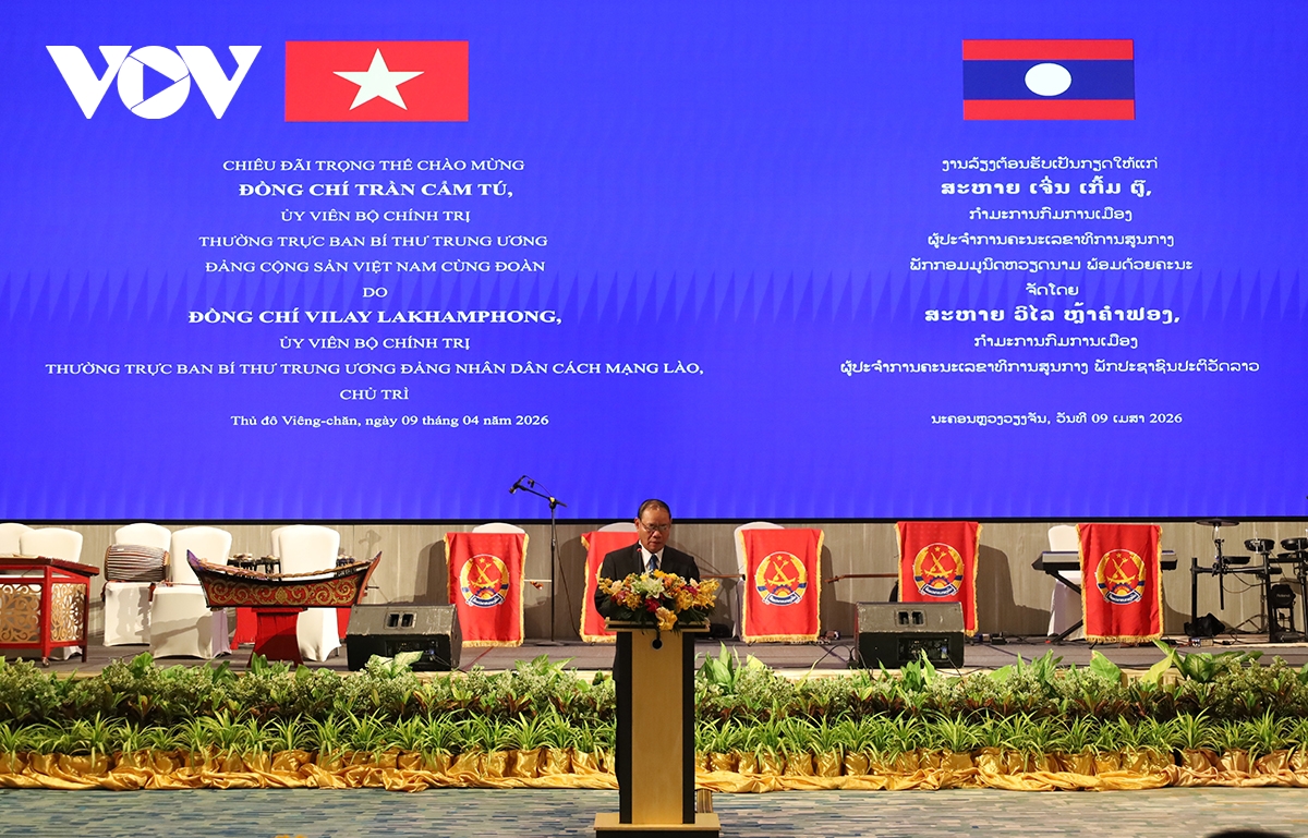 Cũng trong khuôn khổ chuyến thăm chính thức Cộng hòa Dân chủ nhân dân Lào, chiều 9/4, đồng chí Trần Cẩm Tú và đoàn đại biểu cấp cao Việt Nam dự chiêu đãi do đồng chí Vilay Lakhamphong, Ủy viên Bộ Chính trị, Thường trực Ban Bí thư Đảng Nhân dân Cách mạng Lào chủ trì.