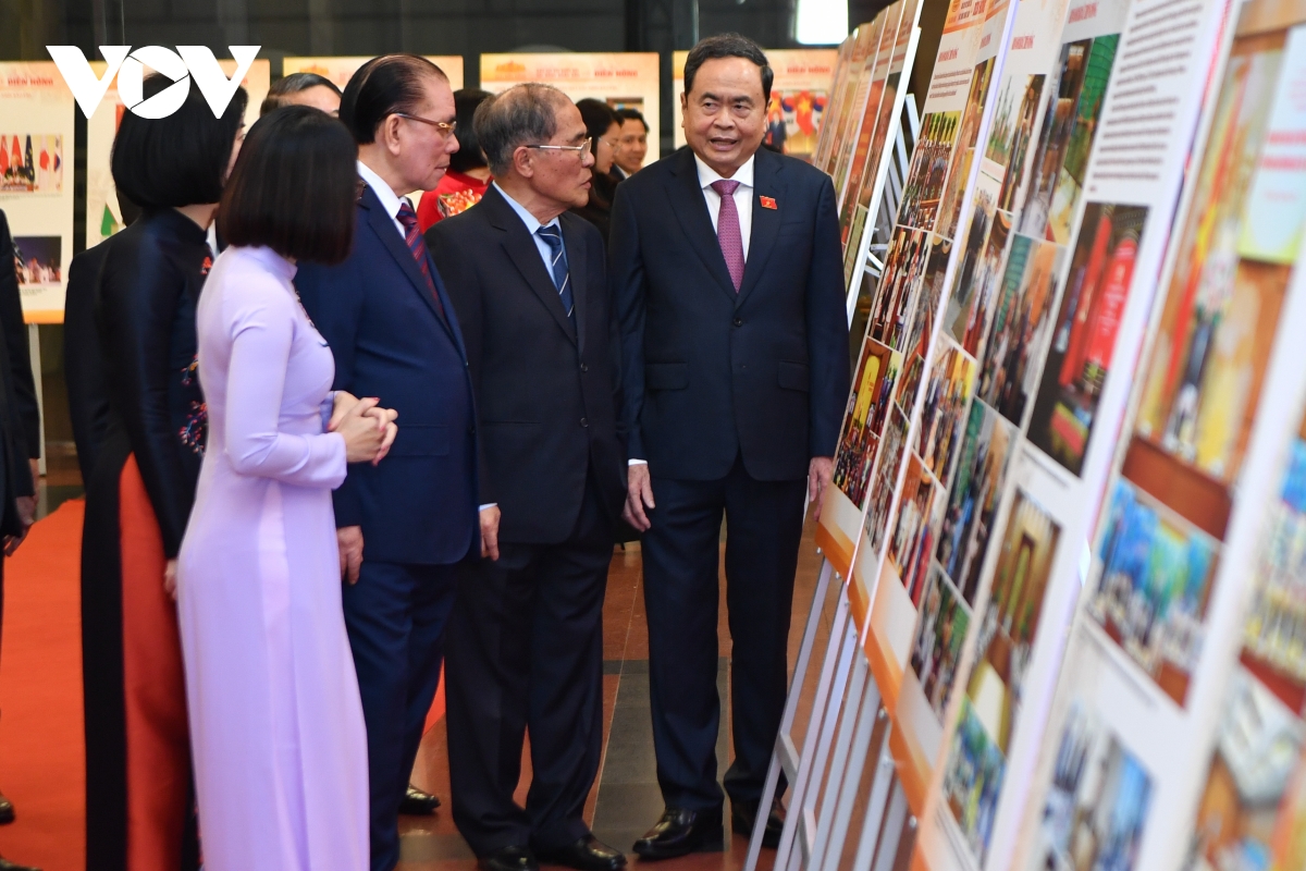 Chủ tịch Quốc hội Trần Thanh Mẫn và các đại biểu tham quan khu trưng bày ảnh Báo chí với Quốc hội, Hội đồng Nhân dân và dấu ấn Diên Hồng