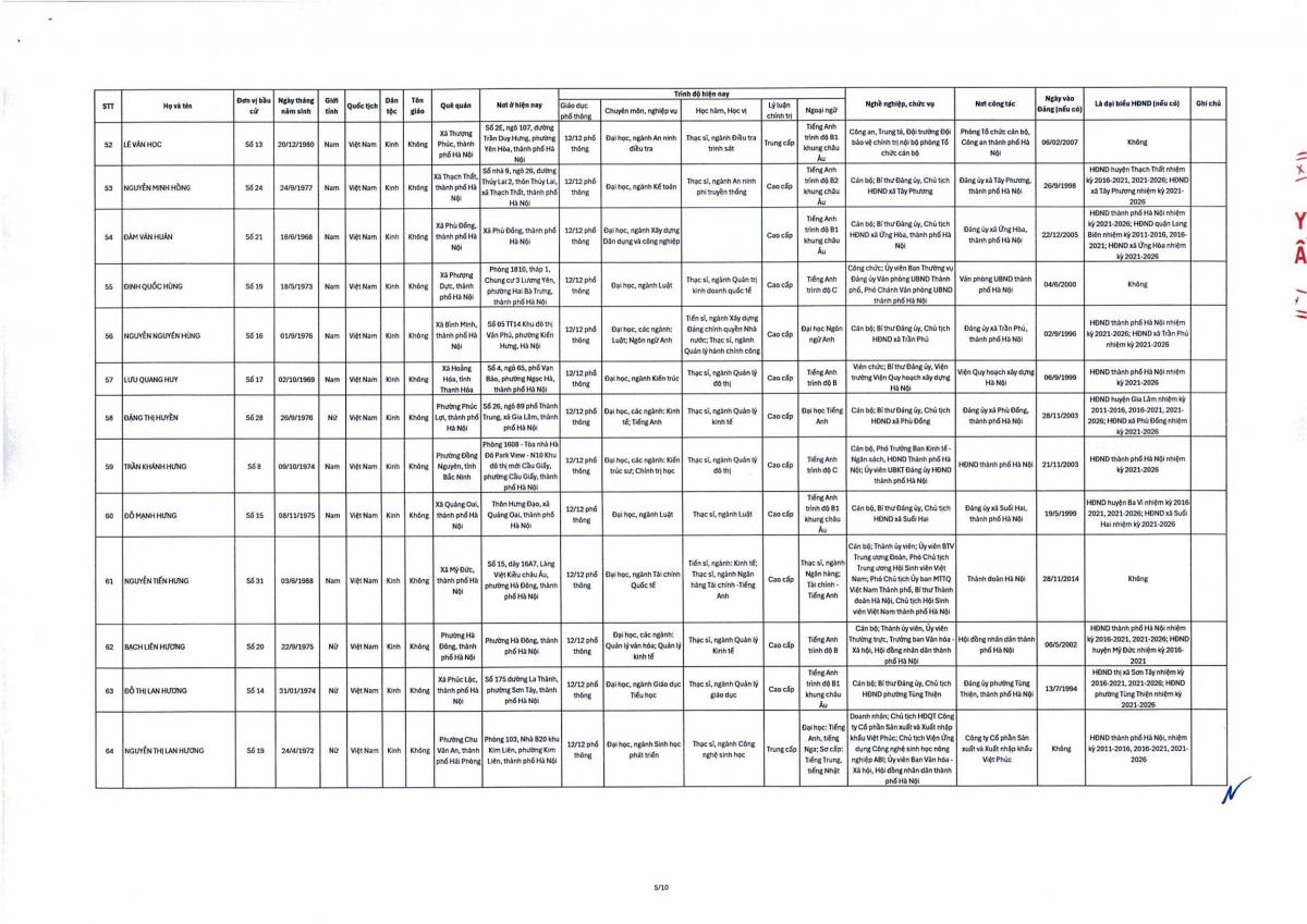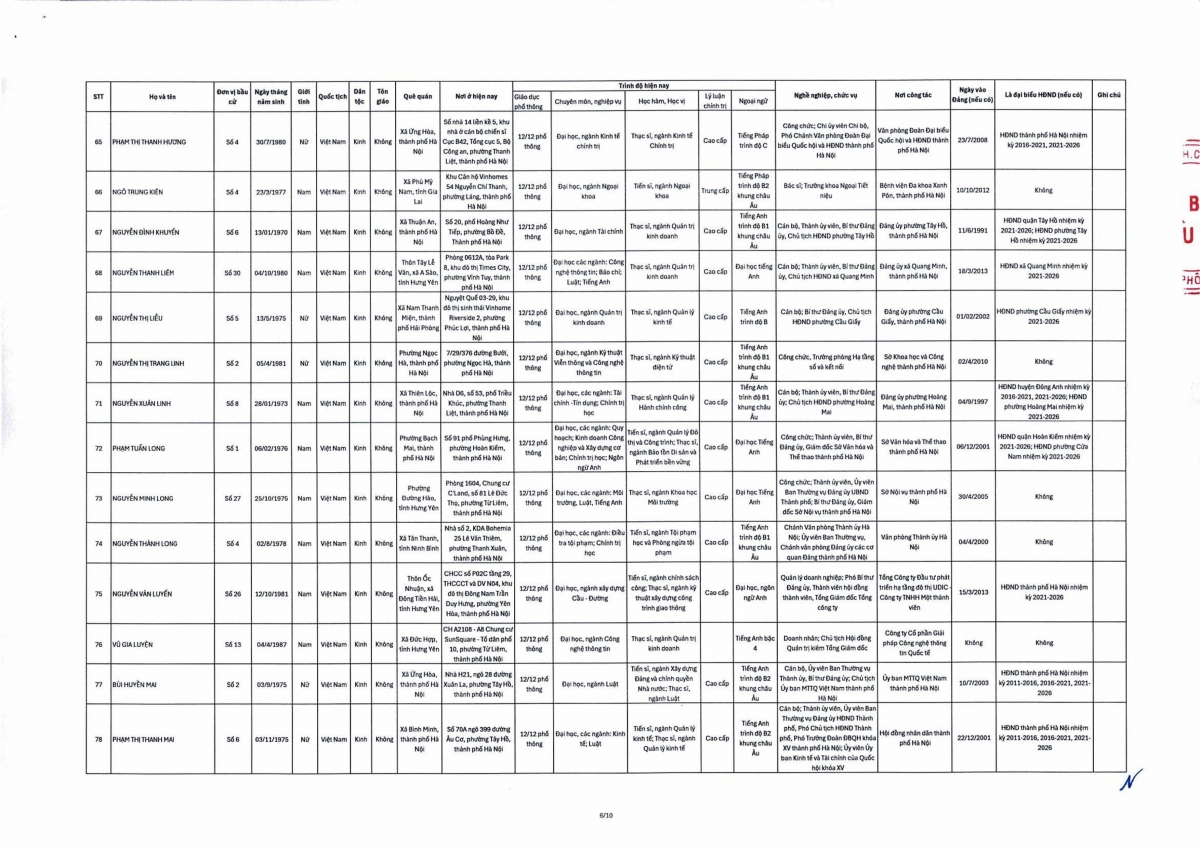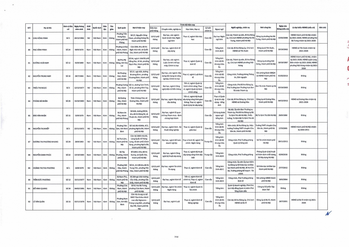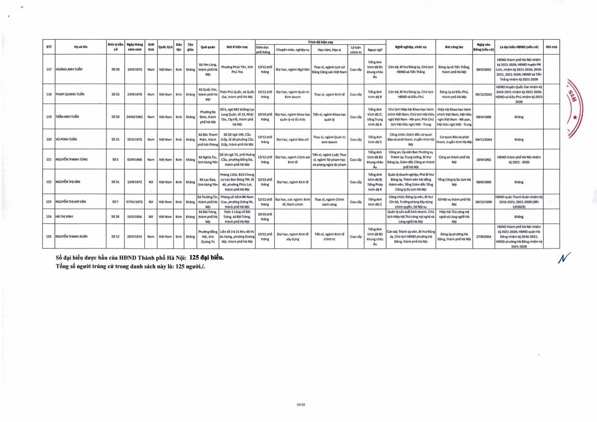 Theo đó, danh sách trúng cử đại biểu HĐND thành phố Hà Nội nhiệm kỳ 2026-2031 gồm 125 người theo danh sách sau: