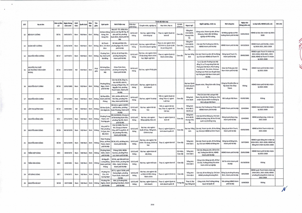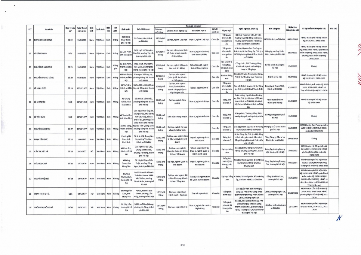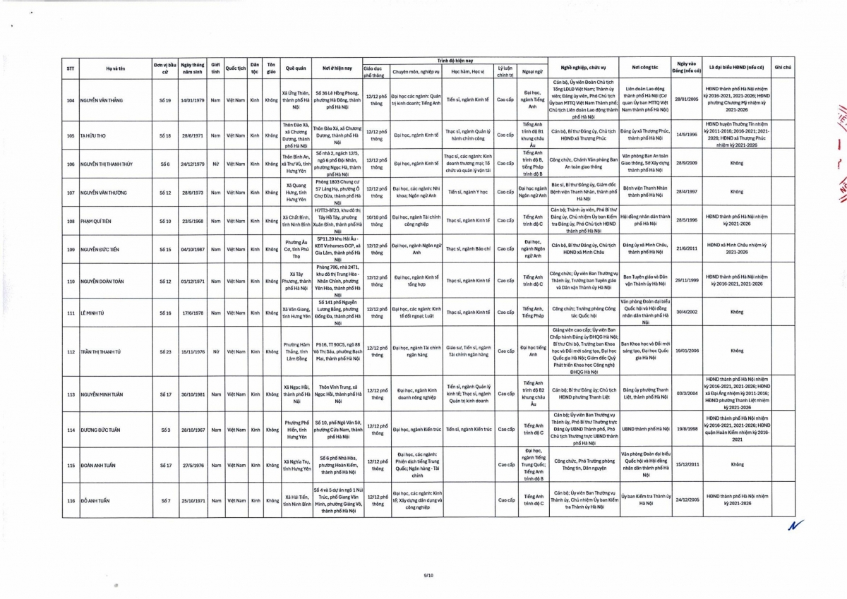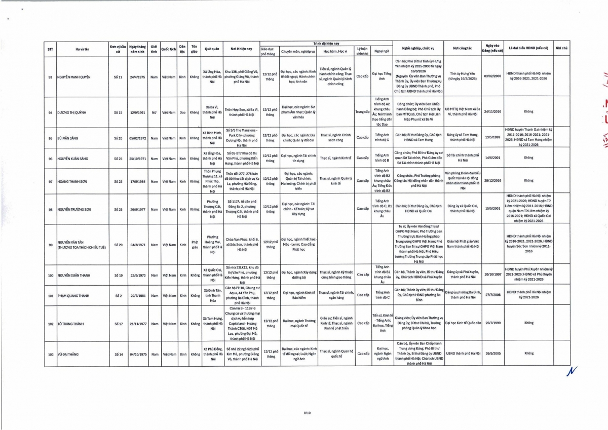 Theo đó, danh sách trúng cử đại biểu HĐND thành phố Hà Nội nhiệm kỳ 2026-2031 gồm 125 người theo danh sách sau: