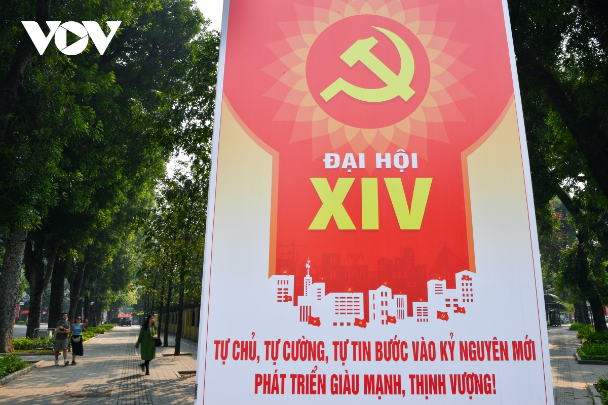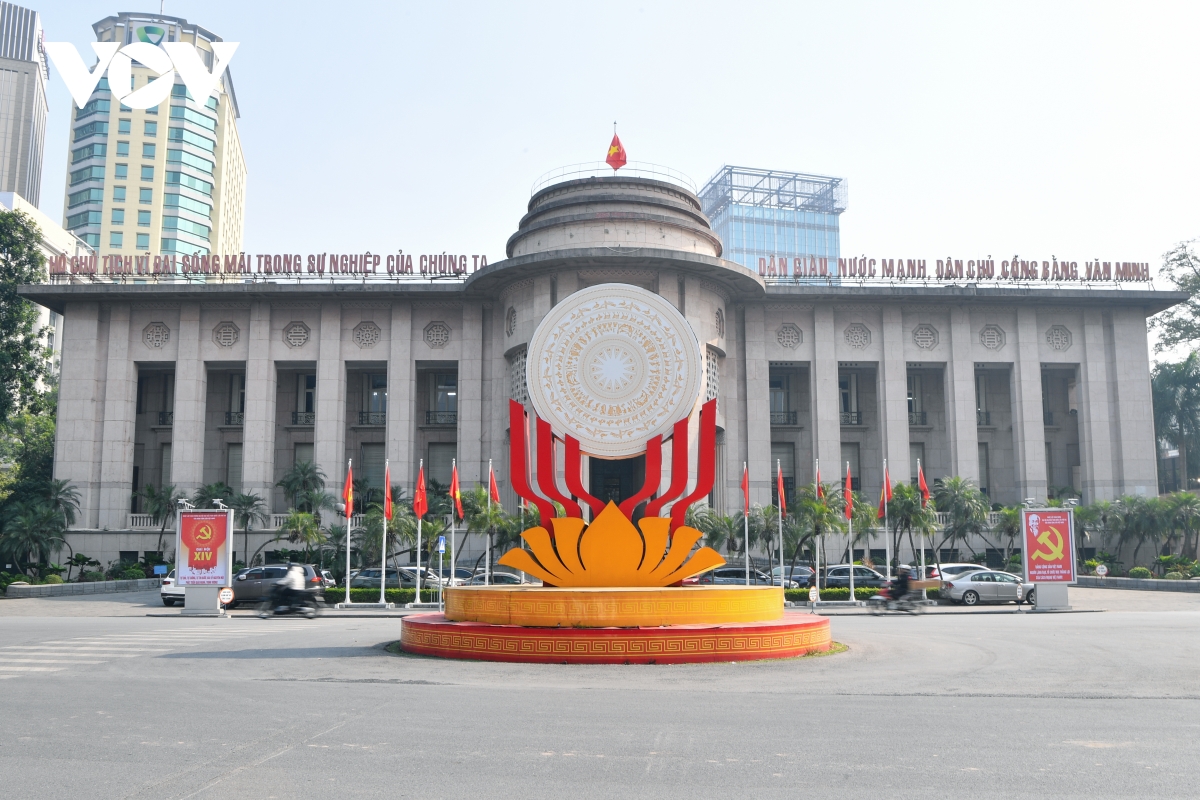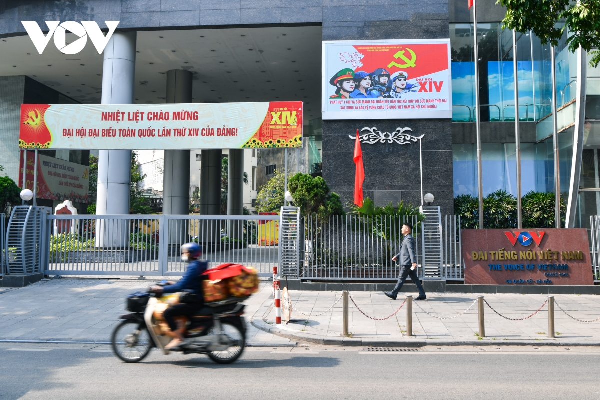 VOV.VN - Đường phố Thủ đô Hà Nội được trang hòa rực rỡ với cờ, hoa, pano, áp phích, khẩu hiệu chào mừng Đại hội đại biểu toàn quốc lần thứ XIV của Đảng.