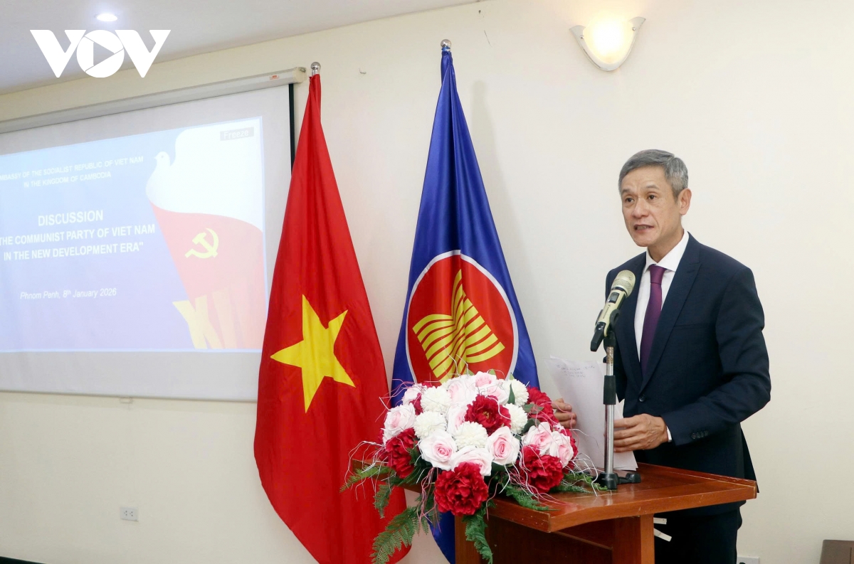 VOV.VN - Tiến tới Đại hội đại biểu toàn quốc lần thứ XIV của Đảng Cộng sản Việt Nam, ngày 8/1, Đại sứ quán Việt Nam tại Vương quốc Campuchia đã tổ chức tọa đàm với chủ đề “Đảng Cộng sản Việt Nam trong kỷ nguyên phát triển mới của Việt Nam”.
