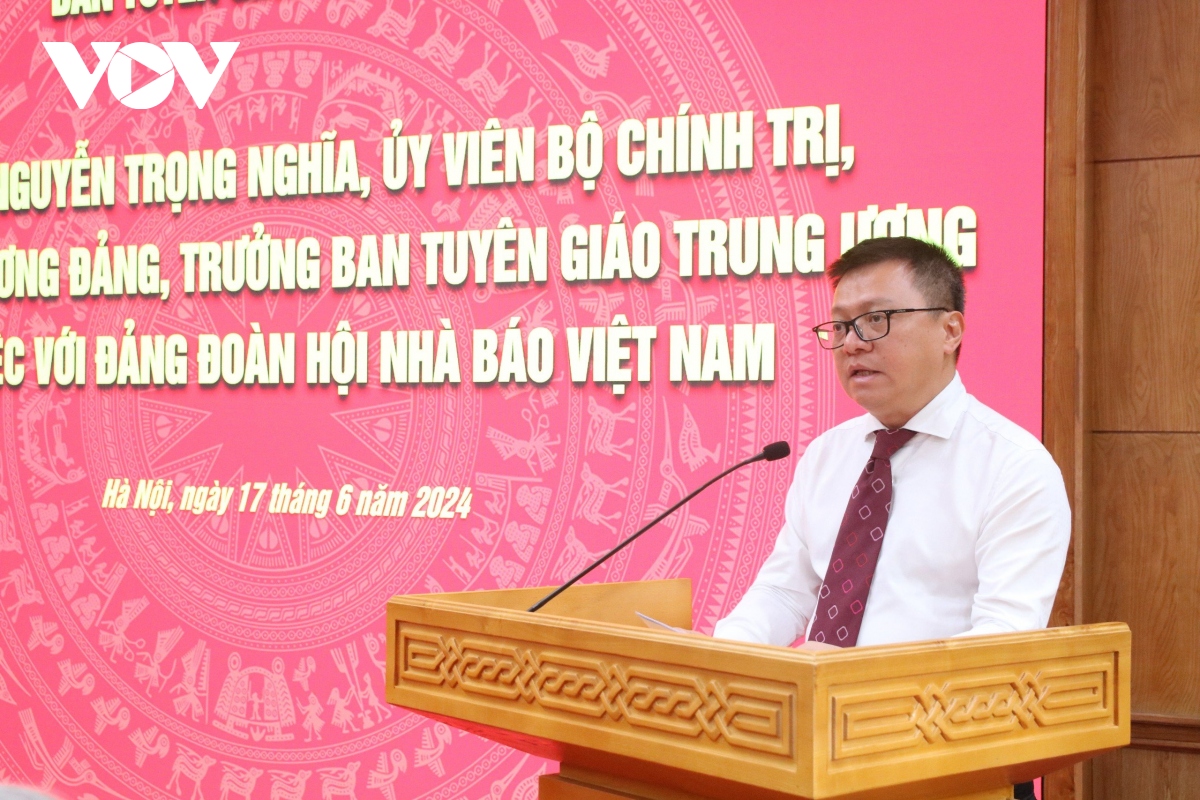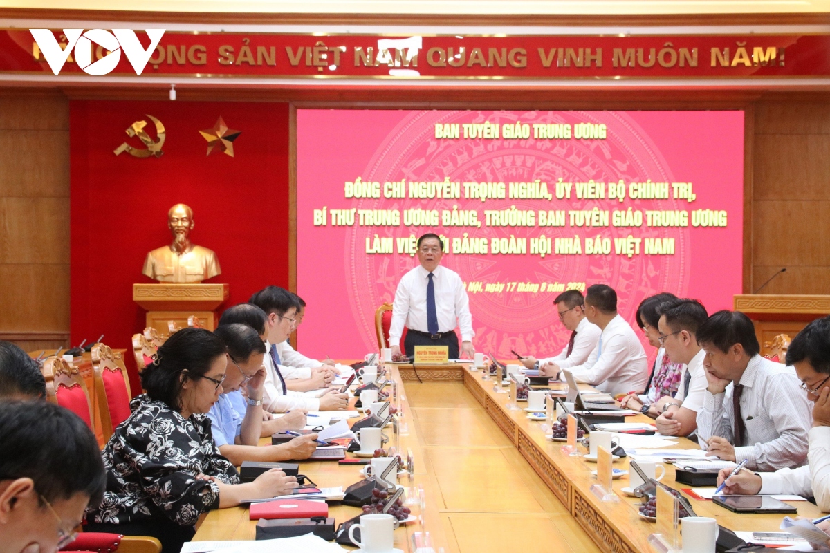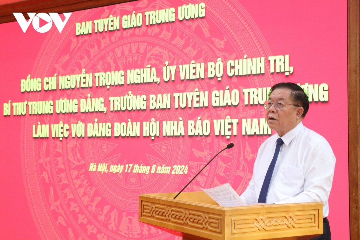 Phát biểu tại buổi làm việc, Trưởng Ban Tuyên giáo Trung ương Nguyễn Trọng Nghĩa nêu rõ, thời gian tới, Đảng đoàn Hội Nhà báo Việt Nam cần tiếp tục chú trọng công tác giáo dục chính trị, tư tưởng để người làm báo nhận thức sâu sắc làm báo là làm cách mạng, người làm báo là chiến sĩ tiên phong trên mặt trận tư tưởng - văn hóa của Đảng; tiếp tục phát huy tốt vai trò, sứ mệnh nghề nghiệp, thực hiện hiệu quả nhiệm vụ chính trị được Đảng, Nhà nước và Nhân dân tin tưởng, giao phó.