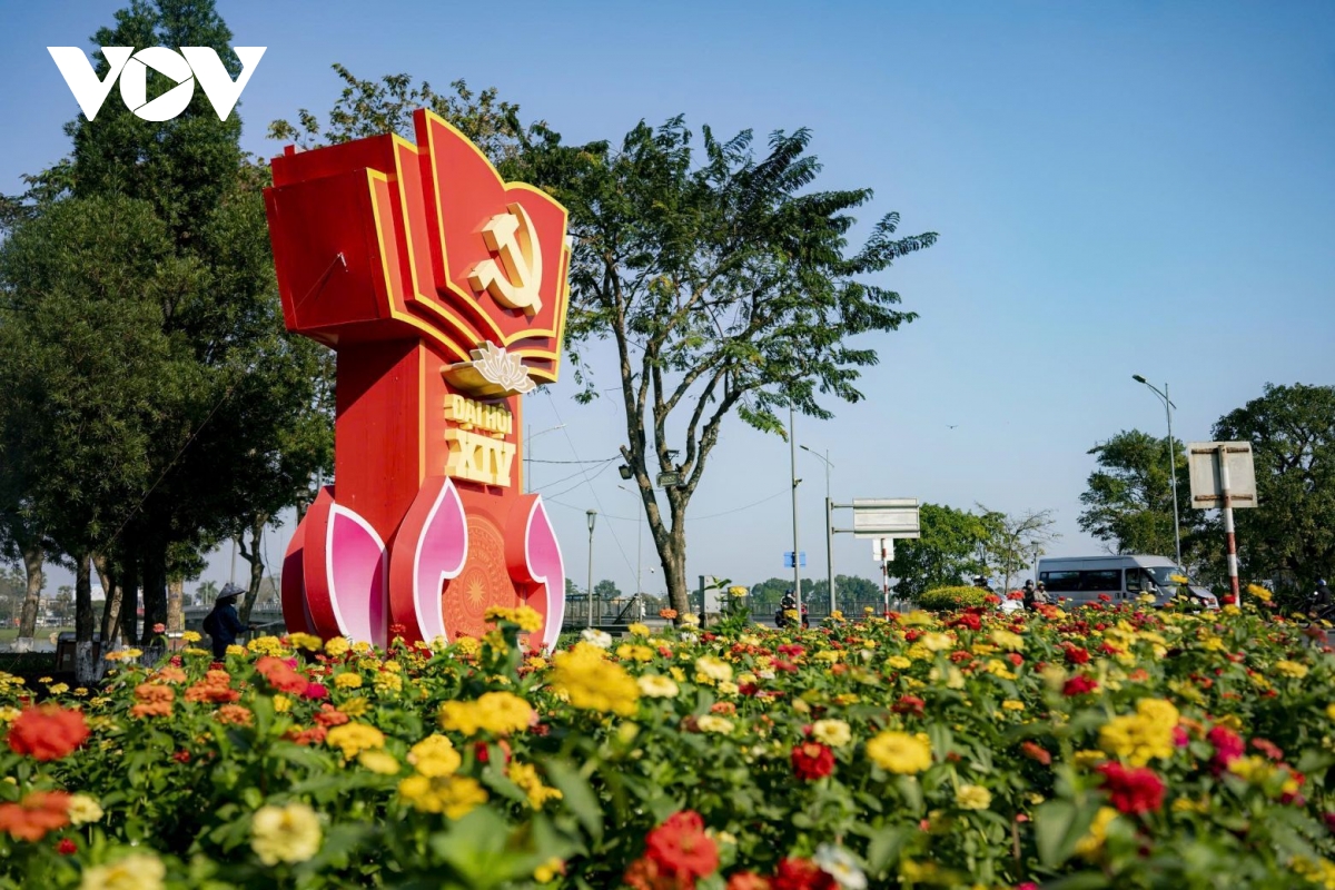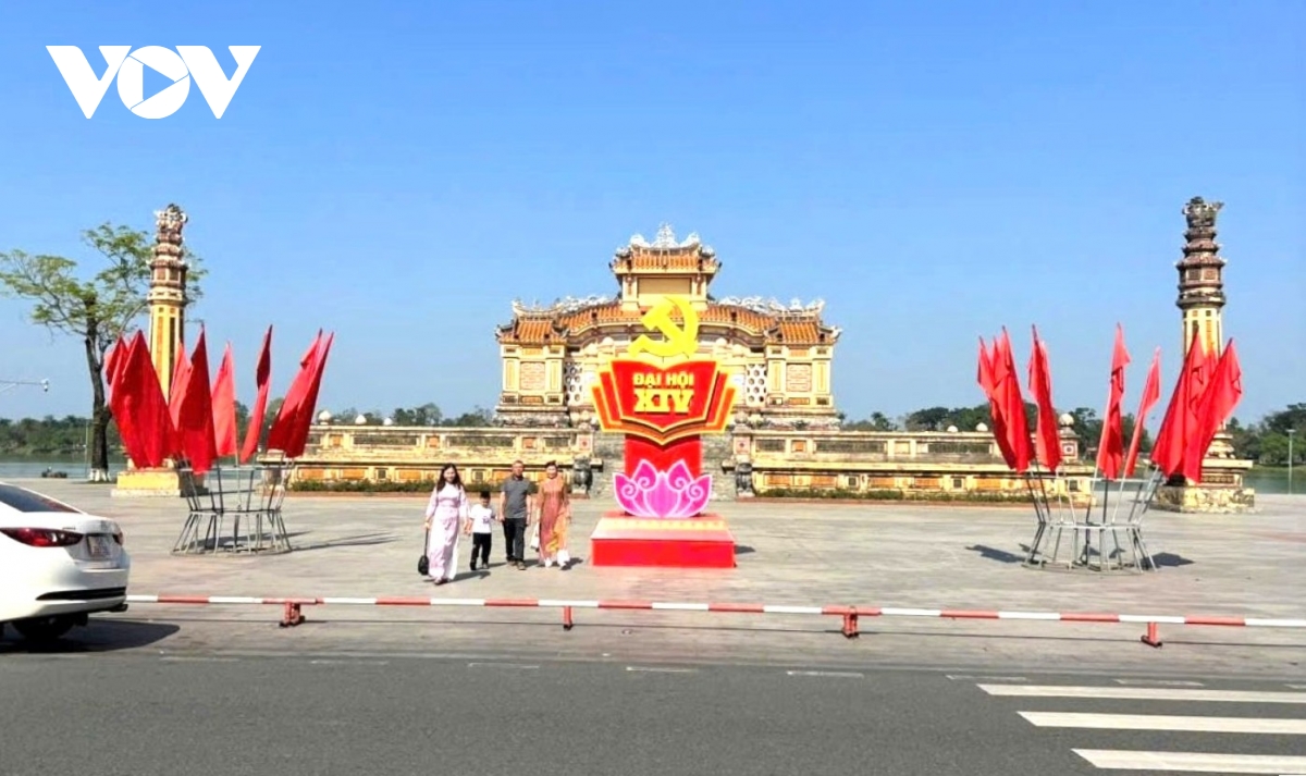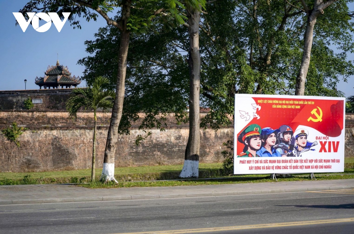 VOV.VN - Những ngày này, nhiều nơi tại thành phố Huế, trên các tuyến đường, trụ sở làm việc... được trang hoàng, treo cờ Đảng, cờ Tổ quốc và băng rôn, khẩu hiệu chào mừng Đại hội XIV của Đảng, sự kiện chính trị trọng đại của đất nước.
